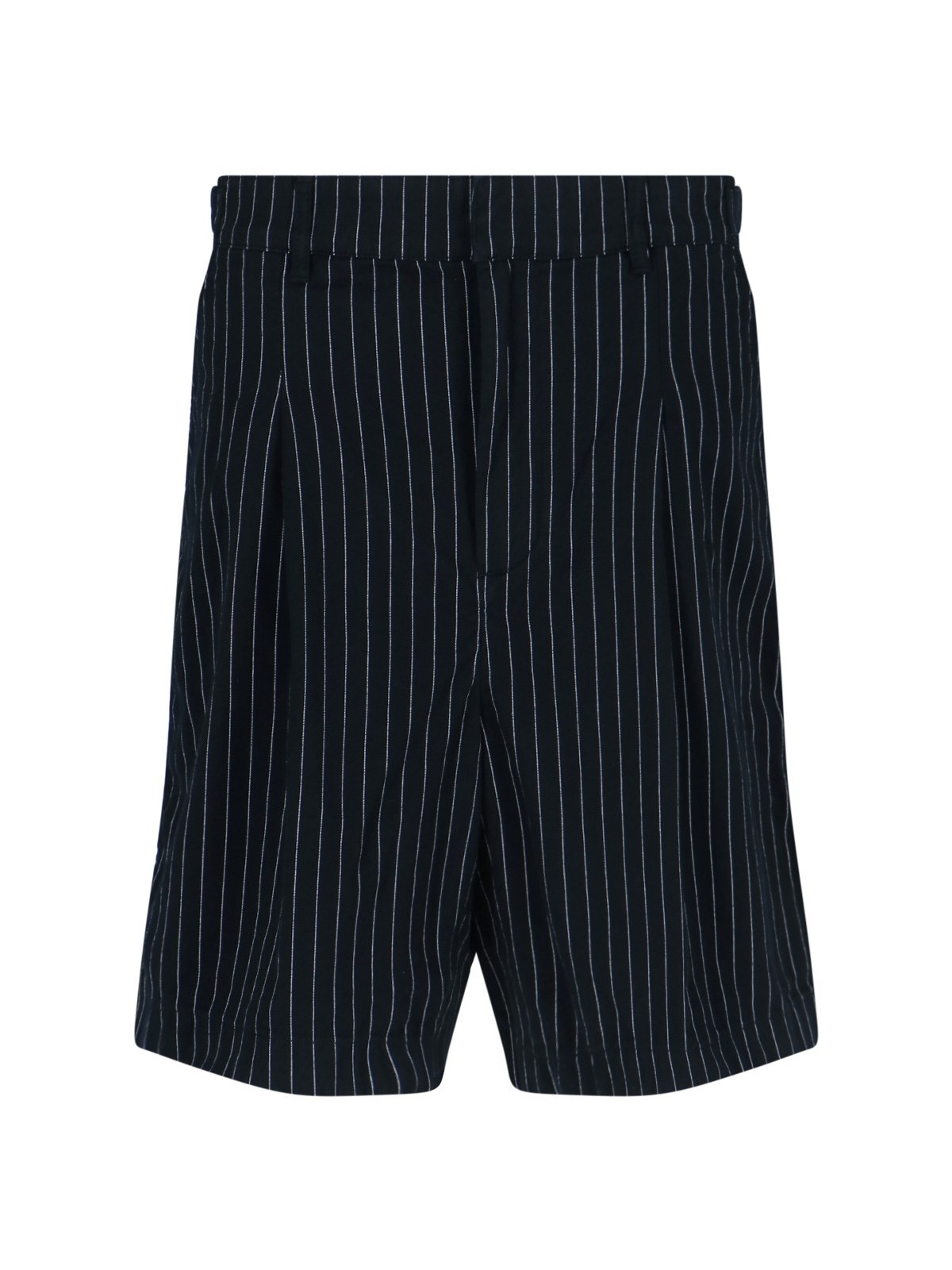ENTIRE STUDIOS 'AOSHI' BERMUDA SHORTS IN BLACK COTTON WITH PINSTRIPE PATTERN, MID WAIST, BELT LOOPS, HOOK AND ZIP CLOSURE, ADJUSTABLE SIDE STRAPS, TWO SIDE POCKETS, TWO BACK BUTTON FLAP POCKETS, STRAIGHT LEG. PRODUCT INFO PRODUCT CODE ESU S25 5007 NONOCTURNE COMPOSITION: 100% COTTON SIZE AND FIT: REGULAR FIT MADE IN: CHINA