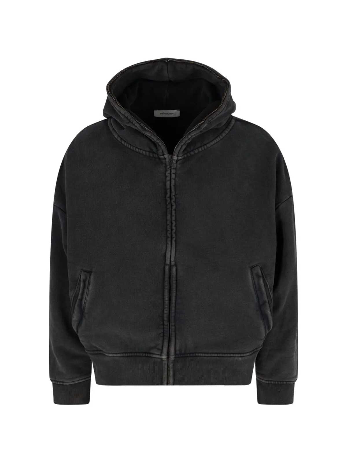 ENTIRE STUDIOS "ETERNAL ZIP" HOODIE IN BLACK ORGANIC COTTON WITH DISTRESSED EFFECT, ZIP HOOD, ZIP CLOSURE, TWO SIDE POCKETS, RIBBED TRIM, STRAIGHT HEM. PRODUCT INFO PRODUCT CODE UNU 25 1003 WBWASHEDBLACK COMPOSITION: 100% COTTON SIZE AND FIT: SOFT FIT MADE IN: CHINA - PRODUCT MADE FROM ORGANIC RAW MATERIALS