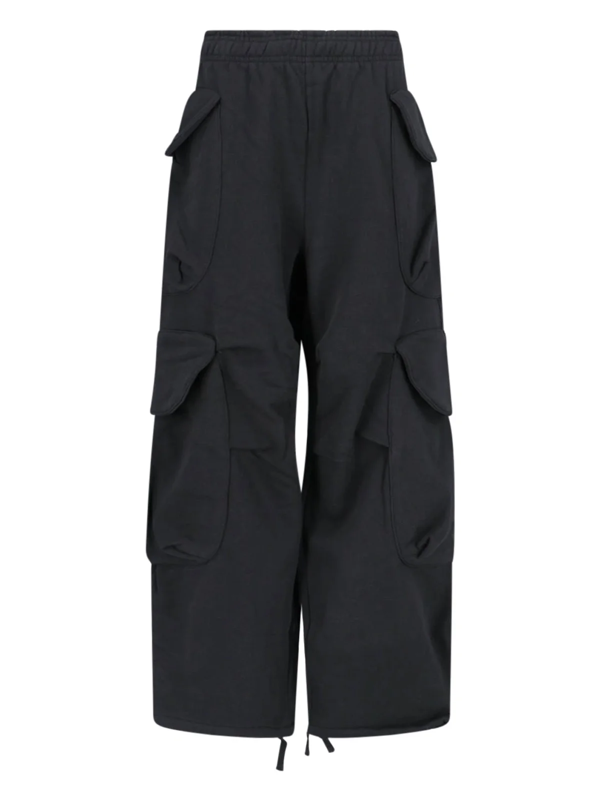 ENTIRE STUDIOS 'GOCAR' BLACK COTTON TRACK PANTS WITH DISTRESSED WASH, HIGH WAIST ELASTIC, DRAWSTRING CLOSURE, FOUR SIDE CARGO POCKETS, DRAWSTRING AT HEM, STRAIGHT LEG. PRODUCT INFO PRODUCT CODE ES2379SOSOOT COMPOSITION: 100% ORGANIC COTTON SIZE AND FIT: SOFT FIT MADE IN: CHINA - PRODUCT MADE FROM RAW MATERIALS OF ORGANIC ORIGIN