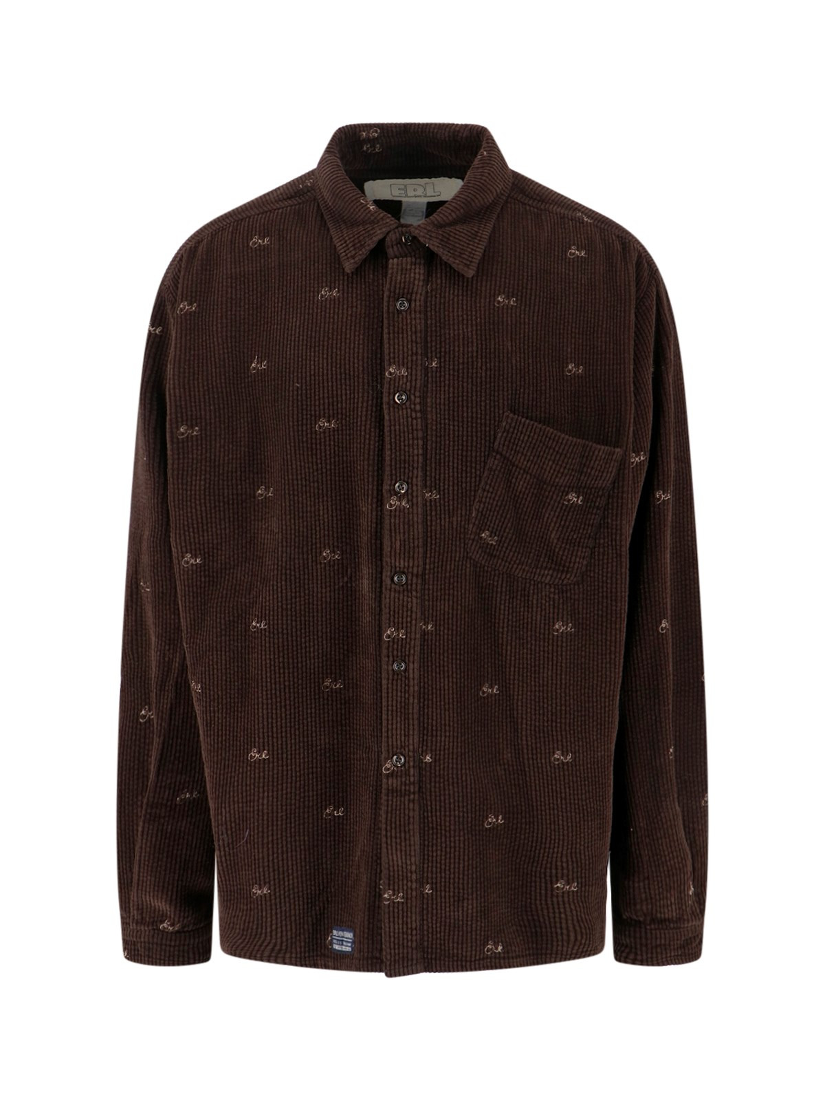 ERL BROWN VELVET SHIRT WITH RIBBED KNIT, CLASSIC COLLAR, BUTTON CLOSURE, ALL-OVER TONE-ON-TONE LOGO EMBROIDERY, CHEST POCKET, TWO BACK PLEATS, BUTTON CUFFS, STRAIGHT HEM. PRODUCT INFO PRODUCT CODE ERL11B0101 COMPOSITION: 100% COTTON SIZE AND FIT: REGULAR FIT MADE IN: ITALY
