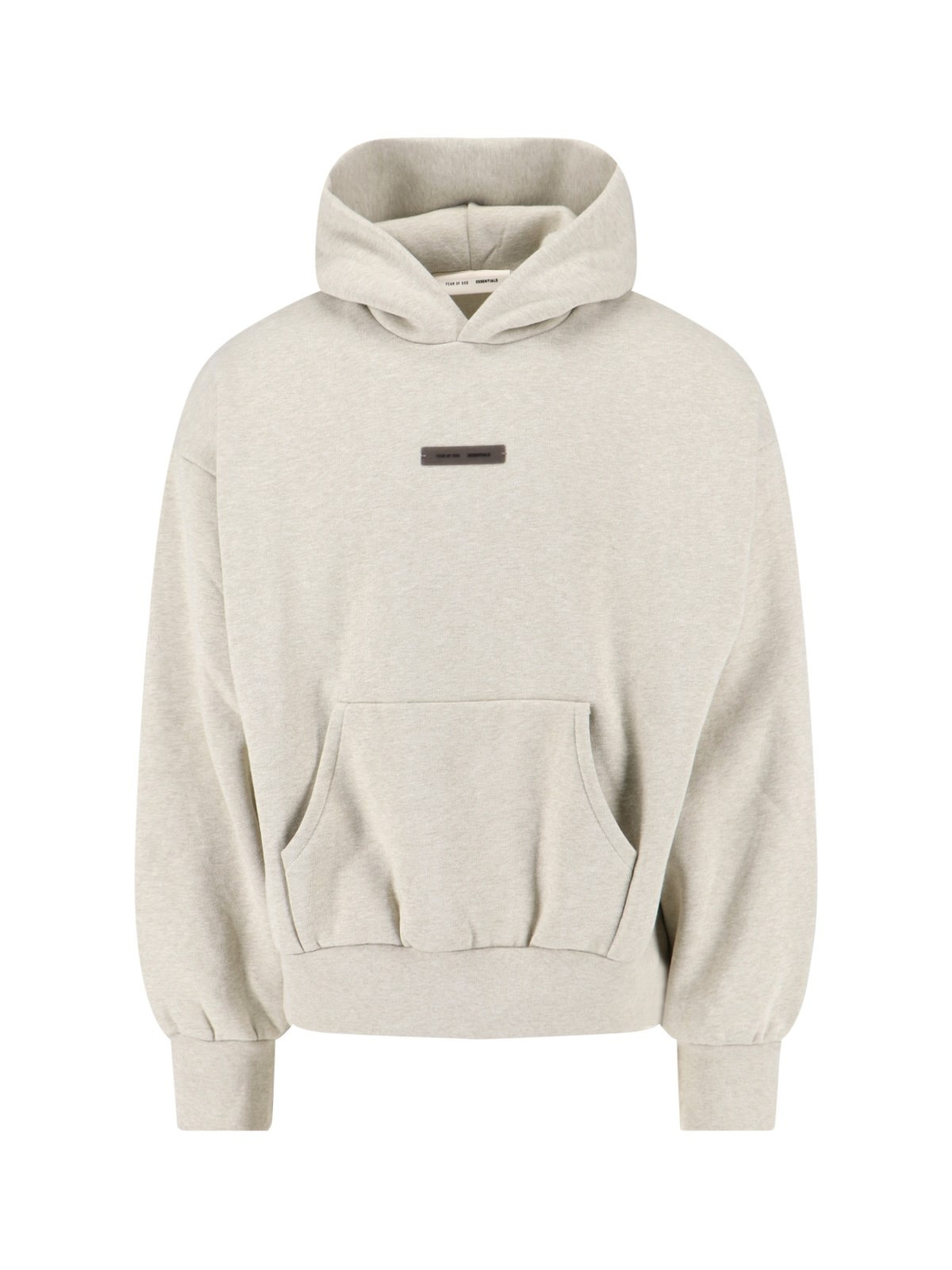 FEAR OF GOD ESENTIALS LOGO HOODIE IN GRAY COTTON BLEND WITH DROPPED SHOULDERS, CONTRASTING LOGO LABEL ON THE FRONT AND BACK, MAXI BOTTOM POCKET, BEVELED METAL LOGO AT THE BACK, ELASTIC HEM AND WAIST, RIBBED TRIM, STRAIGHT HEM. PRODUCT INFO PRODUCT CODE 192SP252052FHEATHER STONE COMPOSITION: 80% COTTON, 20% POLYESTER SIZE AND FIT: REGULAR FIT MADE IN: VIET NAM