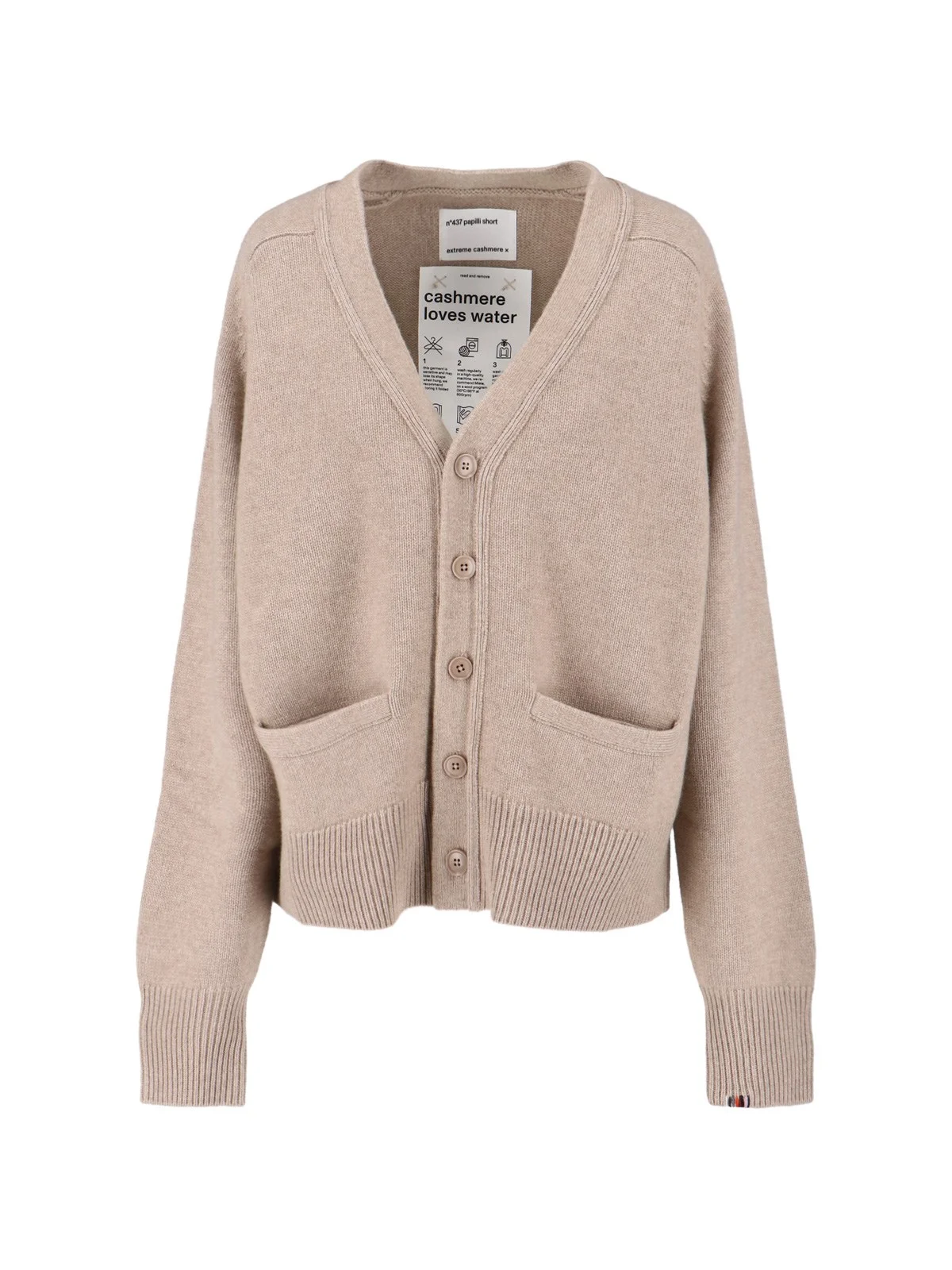 EXTREME CASHMERE 'N°437 PAPILLI SHORT' CARDIGAN IN BEIGE CASHMERE WITH DROPPED SHOULDERS, V-NECK, BUTTON CLOSURE, TWO SIDE POCKETS, MULTICOLOR LOGO EMBROIDERY ON THE CUFF, RIBBED TRIMS, STRAIGHT HEM. PRODUCT INFO PRODUCT CODE PAPILLI SHORTOAT COMPOSITION: 100% CASHMERE SIZE AND FIT: SOFT FIT MADE IN: CHINA