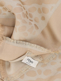FENDI ANIMAL SCARF IN BROWN SILK BLEND WITH LIGHT SHADE, ALL-OVER JACUARD ANIMALIER PATTERN, FRONT LOGO, SQUARE DESIGN, FRAYED EDGES. PRODUCT INFO PRODUCT CODE FXT069 AWEPF0RV9 COMPOSITION: 38% SILK, 27% VISCOSE, 25% VIRGIN WOOL, 10% METALLIZED POLYESTER SIZE AND FIT: H 140 X W 140 CM MADE IN: ITALY
