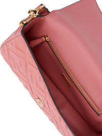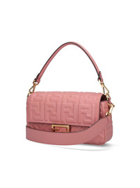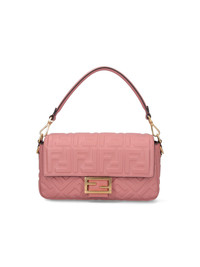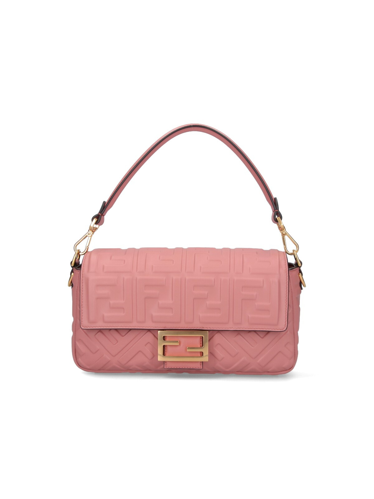 FENDI BAGUETTE BAG IN PINK LEATHER WITH EMBOSSED FF PATTERN, REMOVABLE HANDLE, REMOVABLE SHOULDER STRAP, MAGNETIC STRAP FLAP CLOSURE, GOLD METAL "FF" LOGO BUCKLE DETAIL, INTERIOR ZIP POCKET, AND SINGLE INNER COMPARTMENT. PRODUCT INFO PRODUCT CODE 8BR600 AT57F1TV1 COMPOSITION: 100% CALF LEATHER, LINING: 100% LAMBSKIN SIZE AND FIT: H 15 X W 27 X D 6 CM MADE IN: ITALY - STRAP SPAN: 46 CM