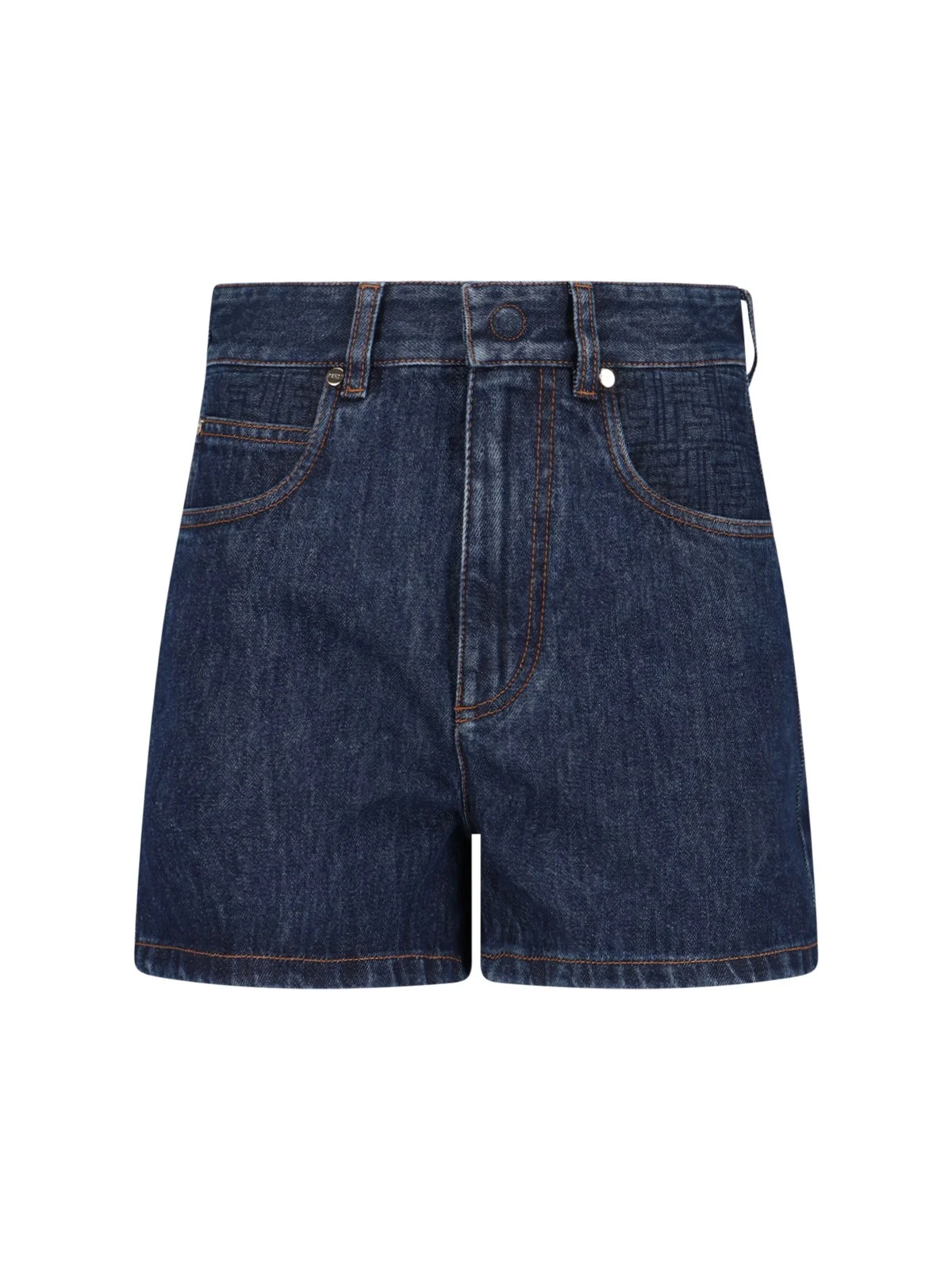 FENDI BLUE COTTON DENIM SHORTS WITH BUTTON AND ZIP CLOSURE, BELT LOOPS, FIVE POCKET DESIGN, EMBROIDERED "FF" LOGO DETAILS, BACK POCKETS, BACK LOGO PATCH, STRAIGHT LEG. PRODUCT INFO PRODUCT CODE FLP861 AW82F1UKI COMPOSITION: 100% COTTON SIZE AND FIT: REGULAR FIT MADE IN: ITALY