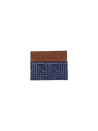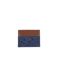 FENDI "FF" CARD HOLDER IN BLUE COTTON WITH JACQUARD LOGO PATTERN, DENIM EFFECT, CALF LEATHER TRIM, SILVER METAL LOGO ON THE FRONT, TOP FLAT POCKET, SIX CARD SLOTS ON THE BACK AND BACK. PRODUCT INFO PRODUCT CODE 7M0164 AUGOF1SCG COMPOSITION: 100% COTTON SIZE AND FIT: H 8 X W 10 CM MADE IN: ITALY - TRIMS: 100% CALF LEATHER
