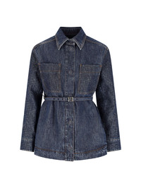 FENDI 'FF' BLUE COTTON DENIM JACKET WITH JACQUARD FF PATTERN ON SLEEVES AND POCKETS, CLASSIC COLLAR, FRONT BUTTON CLOSURE, ADJUSTABLE BELT AT THE WAIST, ARGENATO METALLOB 'FF' LOGO DETAIL ON THE FRONT, TWO FLAT FRONT POCKETS, CONTRASTING LEATHER LOGO TAG AT THE BACK, STRAIGHT HEM. PRODUCT INFO PRODUCT CODE FLF677 AW82F1UKI COMPOSITION: 100% COTTON SIZE AND FIT: REGULAR FIT MADE IN: ITALY