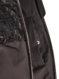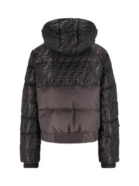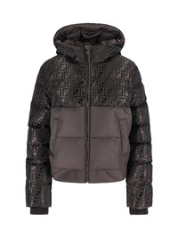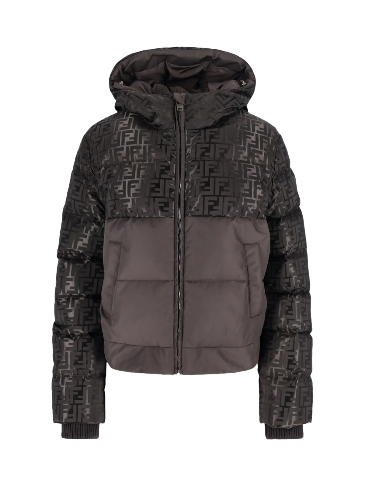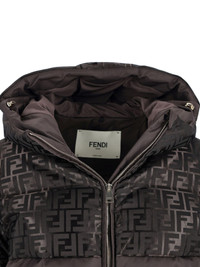 FENDI "FF" DOWN JACKET IN BROWN COTTON BLEND WITH JACQUARD "FF" LOGO PATTERN, HOOD, GOLD METAL ZIP CLOSURE, TWO FRONT POCKETS, RIBBED TRIM, STRAIGHT HEM. PRODUCT INFO PRODUCT CODE FAN225 AT91F1T6H COMPOSITION: 64% COTTON, 36% POLYAMIDE SIZE AND FIT: REGULAR FIT MADE IN: ITALY