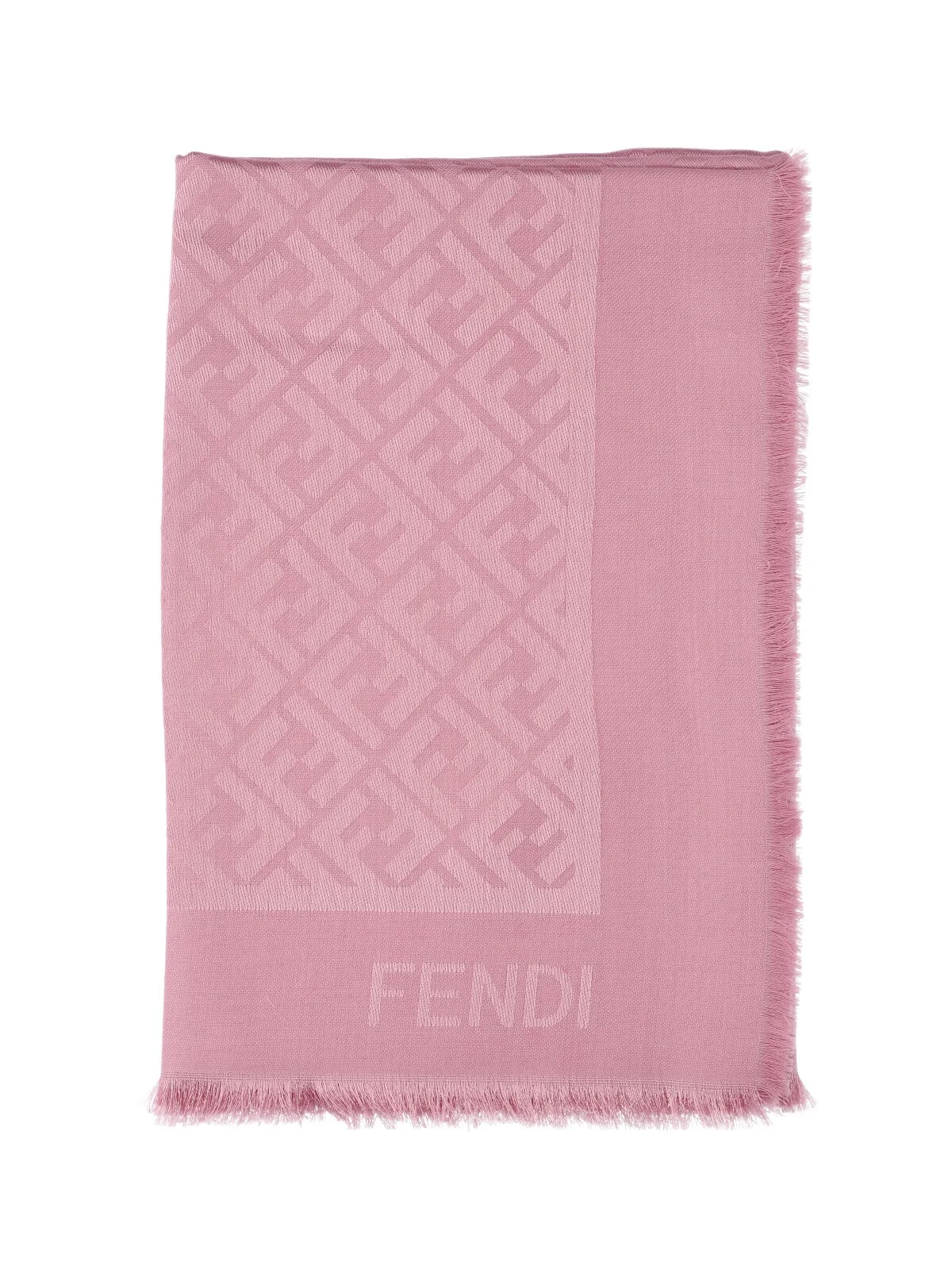 FENDI FF SHAWL IN PINK SILK AND WOOL, ALL-OVER "FF" LOGO PATTERN, CONTRASTING LOGO DETAIL, FRINGE DETAIL. PRODUCT INFO PRODUCT CODE FXT069 AJW7F1WNO COMPOSITION: 60% SILK, 40% WOOL SIZE AND FIT: H 140 X W 140 CM MADE IN: ITALY