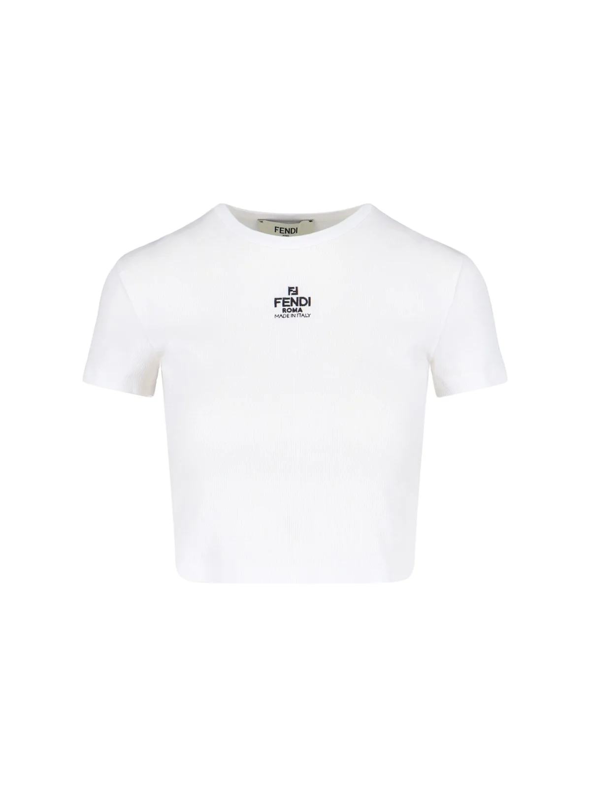 FENDI LOGO CROP T-SHIRT IN WHITE COTTON WITH CREWNECK, SHORT SLEEVES, CONTRASTING LOGO PRINT ON THE FRONT, RIBBED KNIT, AND STRAIGHT HEM. PRODUCT INFO PRODUCT CODE FS8110 ANQMF0ZNM COMPOSITION: 100% COTTON SIZE AND FIT: SLIM MADE IN: ITALIA