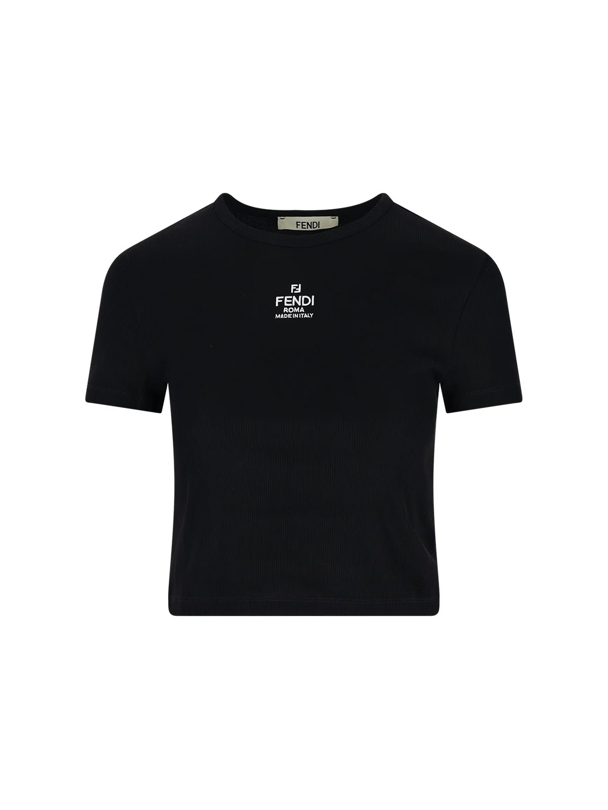 FENDI BLACK COTTON RIBBED LOGO T-SHIRT WITH CREW NECK, SHORT SLEEVES, CONTRAST LOGO EMBROIDERY AT THE FRONT, STRAIGHT HEM. PRODUCT INFO PRODUCT CODE FS8110 ANQMF0GME COMPOSITION: 94% COTTON, 6% ELASTANE SIZE AND FIT: CROPPED FIT MADE IN: ITALY
