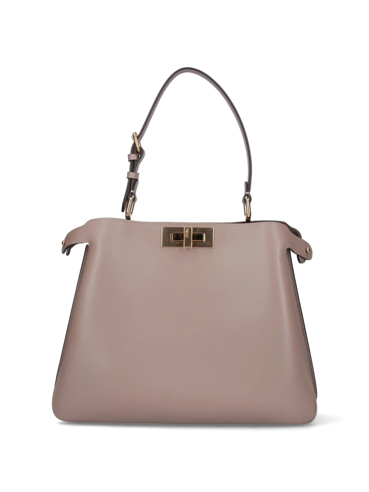 FENDI MEDIUM PEEKABOO SOFT HANDBAG IN TAUPE LEATHER WITH ADJUSTABLE TOP HANDLE, FRONT AND BACK TURN LOCK, GOLD METAL HARDWARE DETAILS, TWO SEPARATE MAIN INNER COMPARTMENTS, TWO FLAT INTERIOR POCKETS. PRODUCT INFO PRODUCT CODE 8BN353 AOVHF0E65 COMPOSITION: 100% LEATHER SIZE AND FIT: H 25.5 X W 33 X D 10 CM MADE IN: ITALY - TRIMS: 100% METAL - HANDLE SPAN: 32 - 48 CM