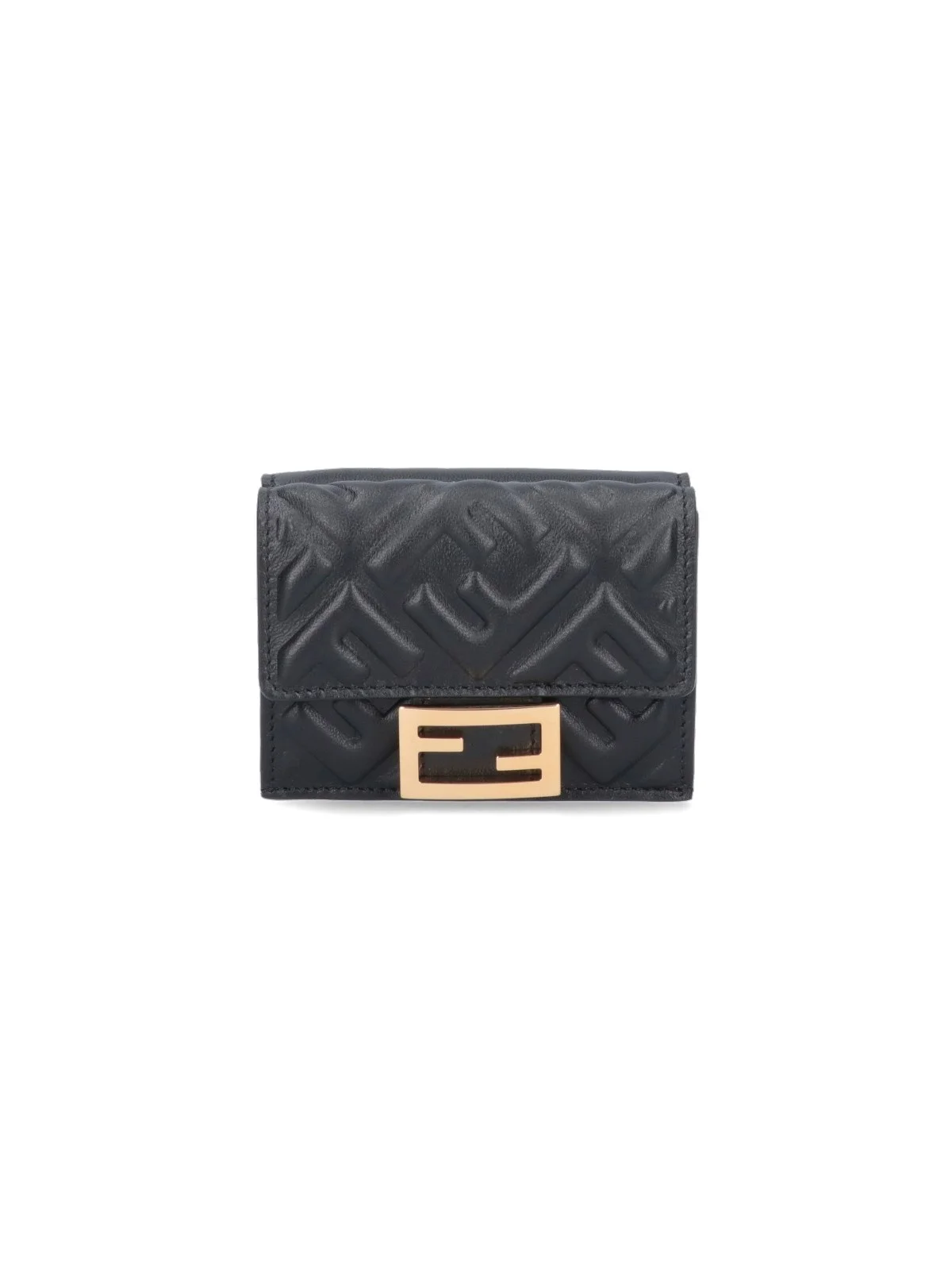 FENDI 'MICRO TRI-FOLD' WALLET, LEATHER, BLACK COLOUR, EMBOSSED FF MOTIF DETAIL, GOLD-COLOURED METALLIC LOGO FASTENING, ONE INTERNAL BANKNOTE COMPARTMENT, THREE INTERNAL CARD SLOTS, ONE EXTERNAL COIN POCKET. PRODUCT INFO PRODUCT CODE 8M0395 AAJDF0KUR - 100% LEATHER - H 7.5 X W 9.5 X D 3 CM - MADE IN ITALY - 8M0395 AAJD-F0KUR MADE IN: ITALY