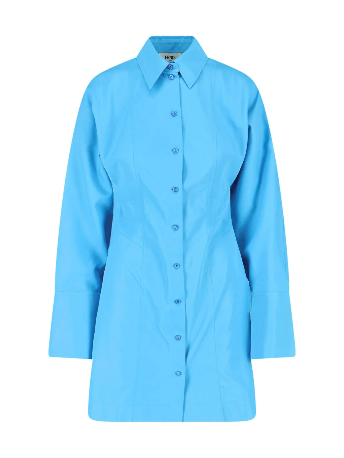 - MINI BUTTONS DRESS FENDI IN BLUE VISCOSE BLEND - CLASSIC COLLAR - BUTTON CLOSURE - LONG SLEEVES - TONE-ON-TONE EMBROIDERED LOGO ON THE BACK - CUFF BUTTONS PRODUCT INFO PRODUCT CODE FDD537 AW9BF1W0L COMPOSITION: 78% VISCOSE, 22% POLYAMIDE SIZE AND FIT: REGULAR FIT MADE IN: ITALY - BUTTONS: 100% MOTHER-OF-PEARL