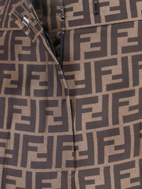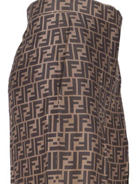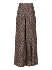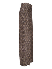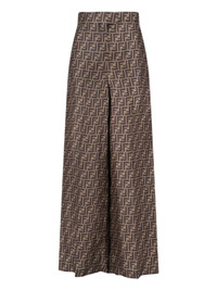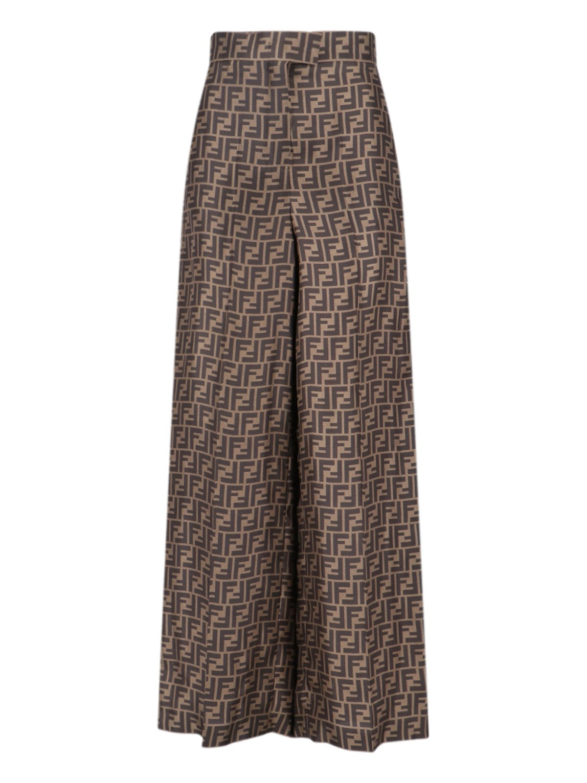 FENDI MONOGRAM "FF" BROWN TWILL PANTS WITH HIGH WAIST, HOOK AND ZIP CLOSURE, TWO SIDE POCKETS, FLARED LEG. PRODUCT INFO PRODUCT CODE FR6606 A8G3F118W COMPOSITION: 100% SILK SIZE AND FIT: SOFT WEARABILITY MADE IN: ITALY