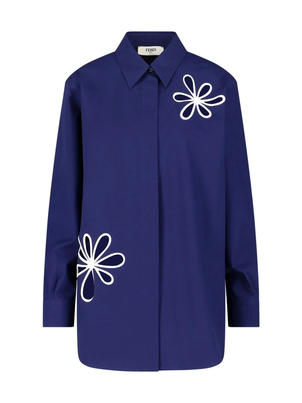 - NAVY BLUE POPLIN SHIRT FENDI - CLASSIC COLLAR - BUTTON CLOSURE - CONTRASTING PERFORATED FLOWER DETAILS - EMBROIDERED LOGO ON SLEEVE - CUFF BUTTONS PRODUCT INFO PRODUCT CODE FS8355 AW7VF1W0A COMPOSITION: 100% COTTON SIZE AND FIT: LOOSE FIT MADE IN: ITALY