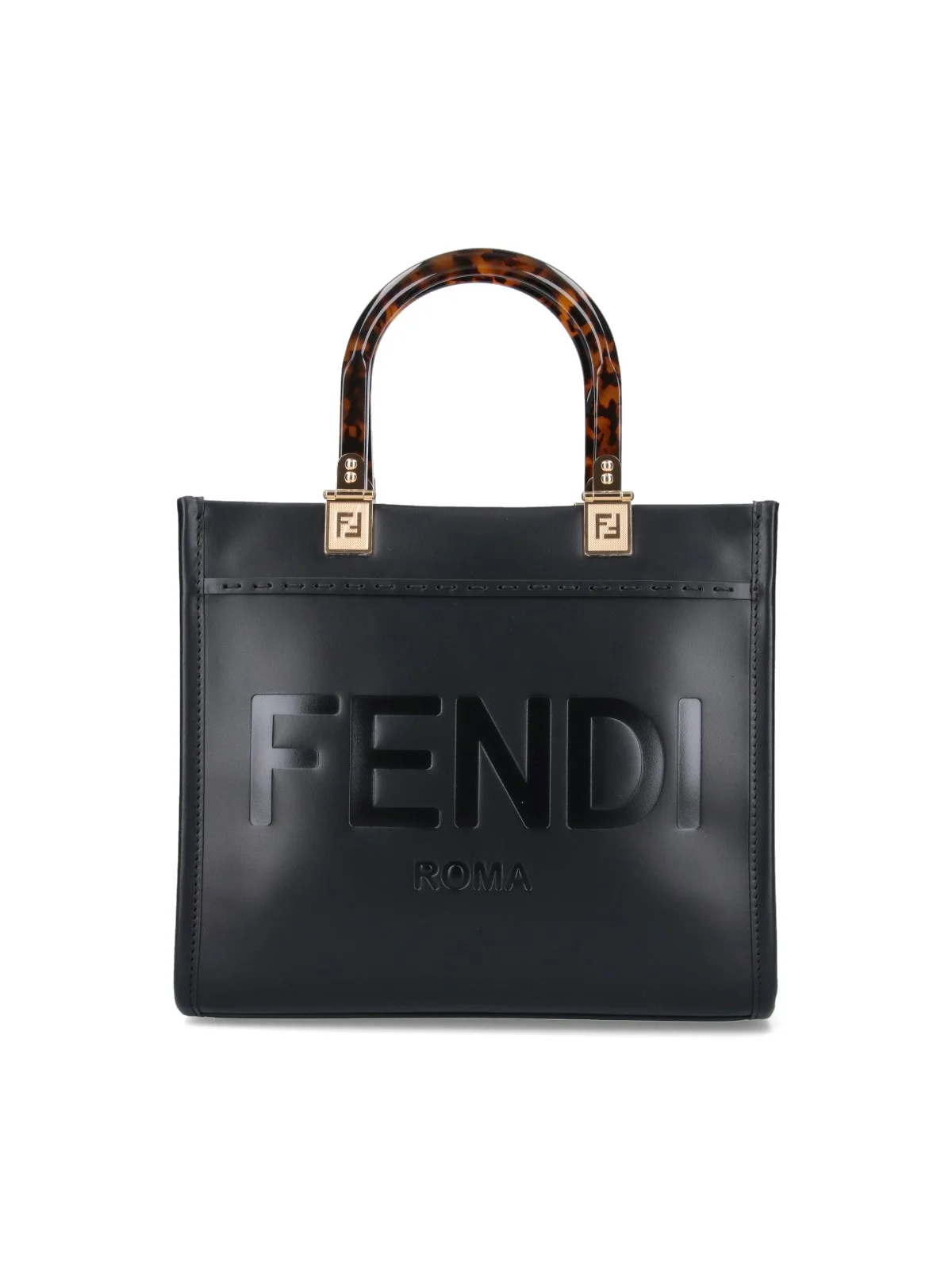 FENDI SUNSHINE SMALL TOTE BAG IN BLACK LEATHER WITH TORTOISESHELL-EFFECT PLEXIGLASS HANDLES, REMOVABLE ADJUSTABLE SHOULDER STRAP, TONE-ON-TONE LOGO ON THE FRONT, AND SINGLE INTERIOR COMPARTMENT. PRODUCT INFO PRODUCT CODE 8BH394 ABVLF0KUR COMPOSITION: 100% LEATHER SIZE AND FIT: H 22.5 X L 25.5 X D 12 CM MADE IN: ITALIA - STRAP SPAN: 41.5 CM
