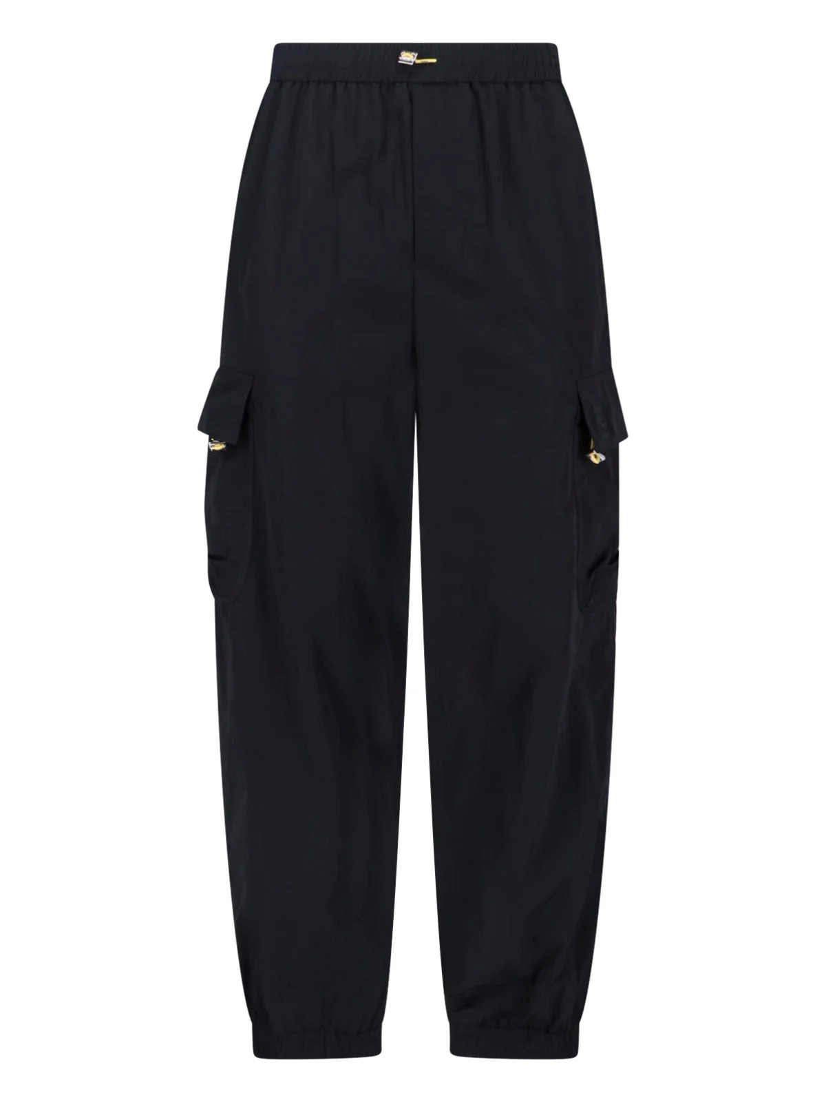 BLACK PANTS IN FENDI TECHNICAL FABRIC WITH MEDIUM ELASTIC WAISTBAND, ADJUSTABLE DRAWSTRING AT THE WAIST, TWO SLANTED SIDE POCKETS, TWO SIDE CARGO POCKETS, EMBROIDERED "FF" LOGO ON THE POCKET, ELASTIC HEMS, STRAIGHT LEG. PRODUCT INFO PRODUCT CODE FB1116 AYU9F0QA1 COMPOSITION: 100% POLYAMIDE SIZE AND FIT: SOFT FIT MADE IN: ITALY