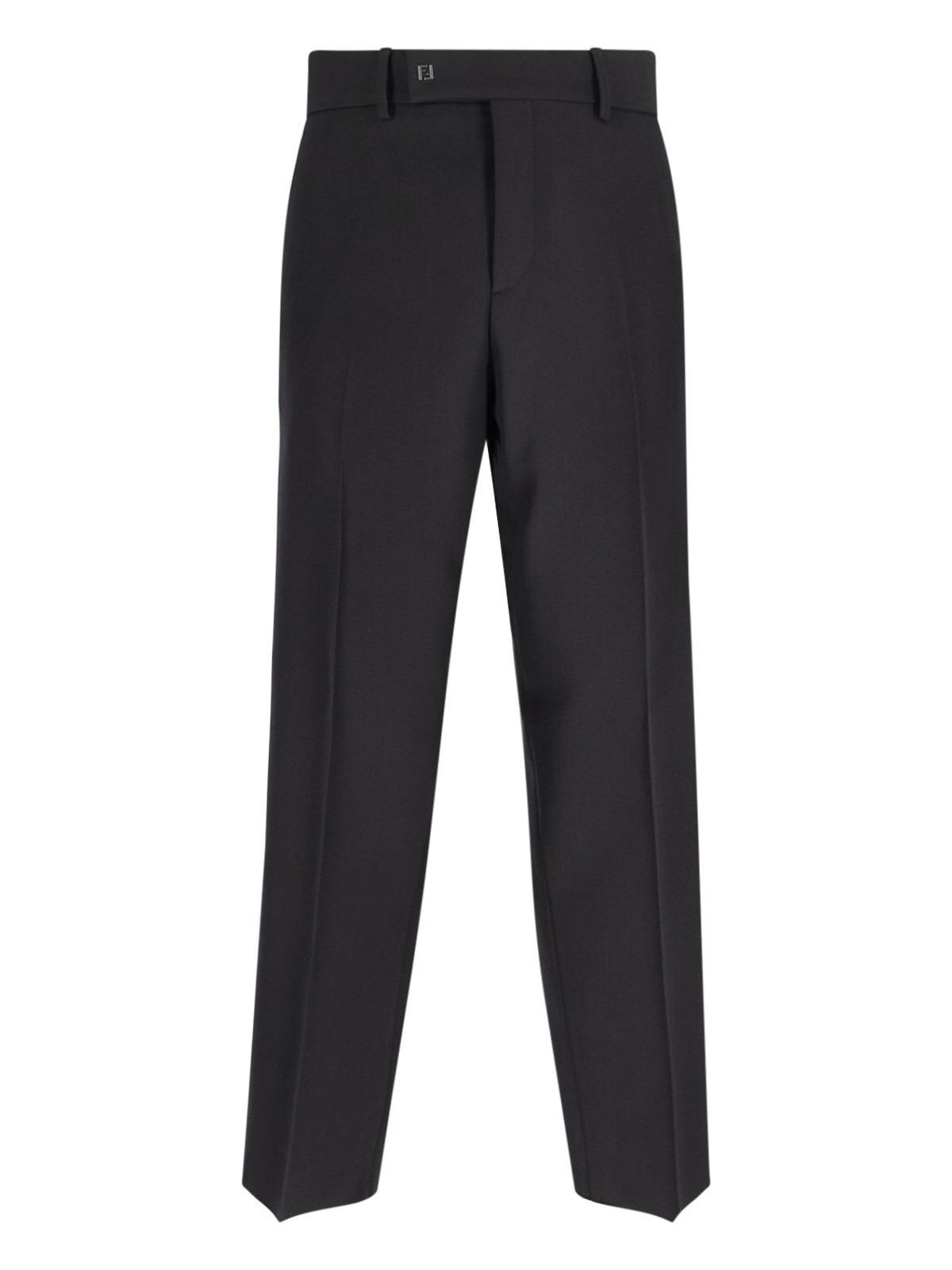 FENDI WOOL BLEND PANTS IN BLACK WITH MID WAIST, BELT LOOPS, BUTTON, HOOK AND ZIP CLOSURE, METAL LOGO DETAIL ON THE FRONT, FRONT AND BACK PLEATS, TWO SIDE POCKETS, TWO BACK POCKETS, STRAIGHT LEG. PRODUCT INFO PRODUCT CODE FB1089 ASCBF0TY8 COMPOSITION: 55% POLYESTER, 45% VIRGIN WOOL SIZE AND FIT: REGULAR FIT MADE IN: ITALY