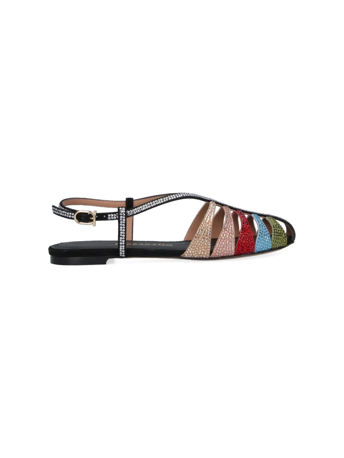 FERRAGAMO MULTICOLOR GOAT LEATHER CAGE SANDALS WITH ROUND TOE ON THE FRONT, ADJUSTABLE ANKLE STRAP CLOSURE, ALL-OVER TONE-ON-TONE RHINESTONES, AND LEATHER SOLE. PRODUCT INFO PRODUCT CODE 790205001 COMPOSITION: 100% GOAT LEATHER MADE IN: ITALY - SOLE: 100% LEATHER