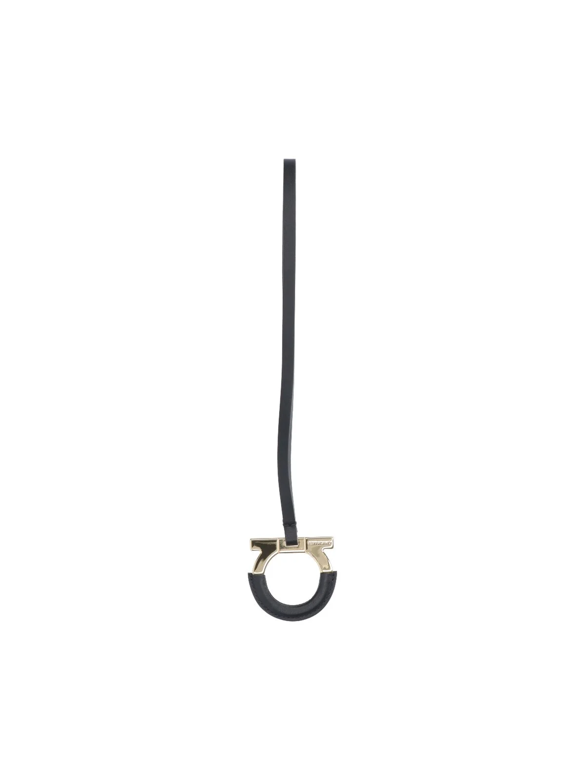 FERRAGAMO "GANCINI" KEYRING CHARM IN BLACK CALF LEATHER WITH GOLD METAL DETAILS, ADJUSTABLE. PRODUCT INFO PRODUCT CODE 786106001 COMPOSITION: 100% CALF LEATHER MADE IN: ITALY