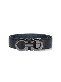FERRAGAMO GANCINI REVERSIBLE BELT IN BLACK LEATHER HAMMERED ON ONE SIDE AND BLUE ON THE OTHER, AND SILVER METAL BUCKLE CLOSURE, ADJUSTABLE. PRODUCT INFO PRODUCT CODE 687611015 COMPOSITION: 100% LEATHER SIZE AND FIT: - HEIGHT: 3.5 CM MADE IN: ITALY