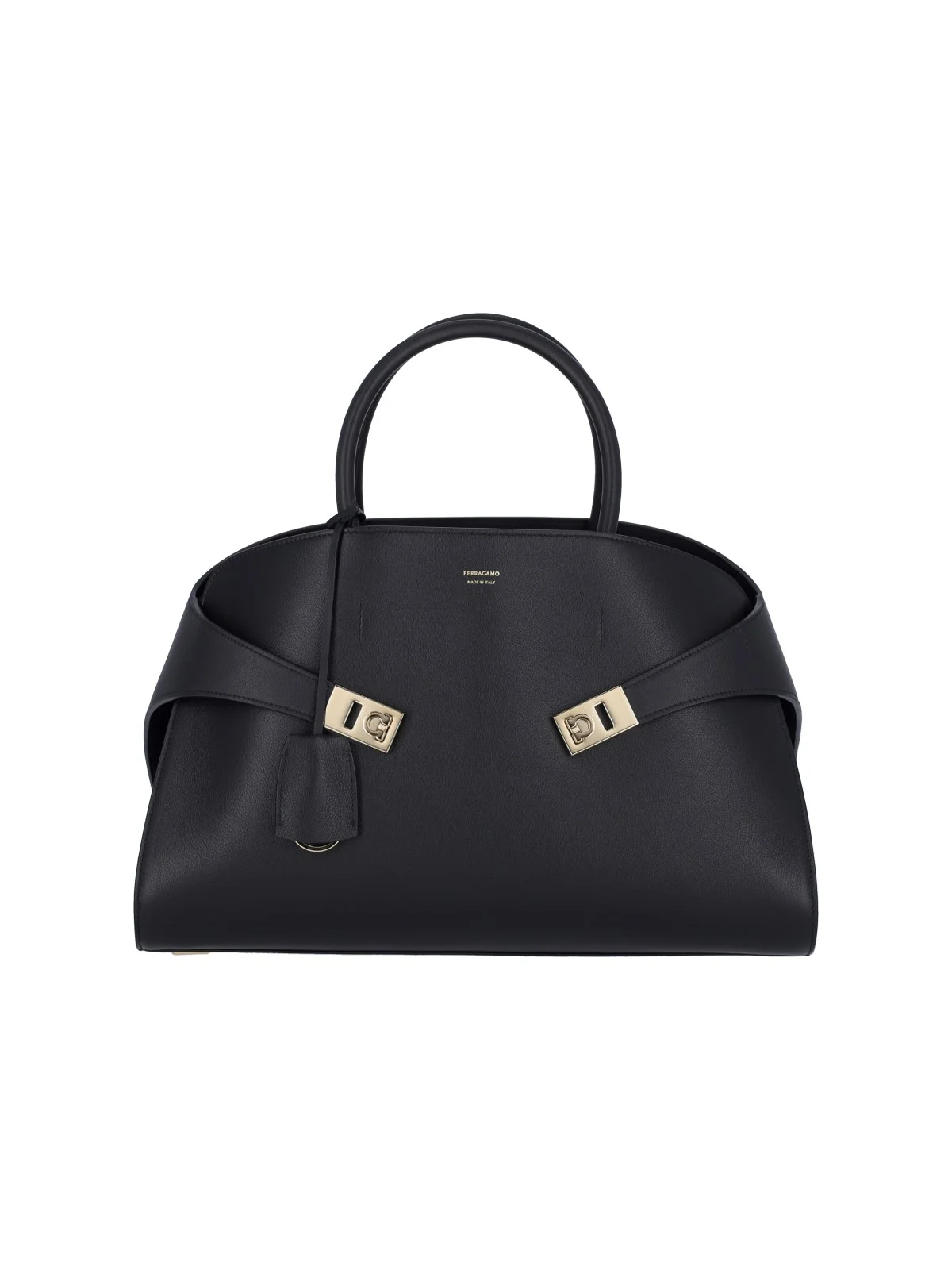 FERRAGAMO HUG M HANDBAG IN BLACK LEATHER WITH RIGID HANDLES, ADJUSTABLE AND REMOVABLE SHOULDER STRAP, GOLD HOOK DETAIL STRAPS ON THE FRONT, REMOVABLE KEYCHAIN CHARM ON THE FRONT, ENGRAVED LOGO DETAIL, INTERIOR ZIPPER POCKET, AND MAIN INTERIOR COMPARTMENT. PRODUCT INFO PRODUCT CODE 766591001 COMPOSITION: 100% CALF LEATHER SIZE AND FIT: H 24 X W 38 X D 22 CM MADE IN: ITALIA