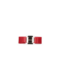 FERRAGAMO "VARA" RED CALF LEATHER HAIR CLIP WITH BOW DETAIL ON THE FRONT, LOGO EMBOSSED ON GOLD METAL ON THE FRONT, AND BACK CLOSURE. PRODUCT INFO PRODUCT CODE 791473001 COMPOSITION: 70% CALF LEATHER, 15% BRASS, 15% PLASTIC MADE IN: ITALY - TRIMS: 100% METAL