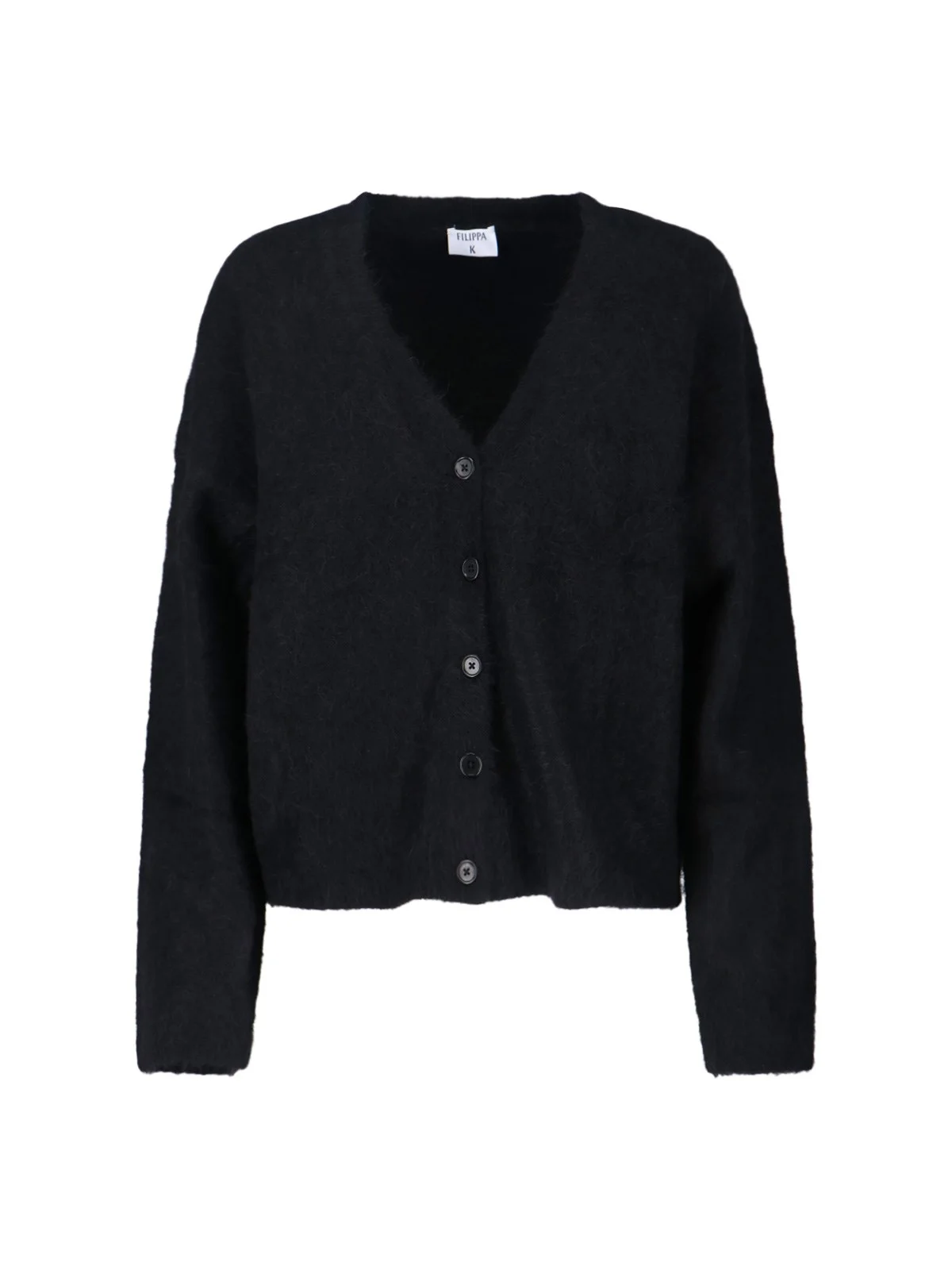 FILIPPA K FLUFFY CARDIGAN IN BLACK ALPACA BLEND WITH DROPPED SHOULDERS, V-NECK, BUTTON CLOSURE, STRAIGHT HEM. PRODUCT INFO PRODUCT CODE 318160240 COMPOSITION: 54% ALPACA, 31% RECYCLED POLYAMIDE, 13% WOOL, 2% ELASTANE SIZE AND FIT: SOFT FIT MADE IN: CHINA - PRODUCT MADE FROM RECYCLED MATERIALS