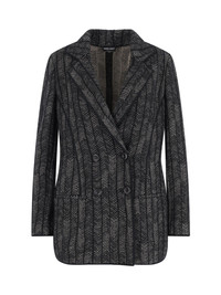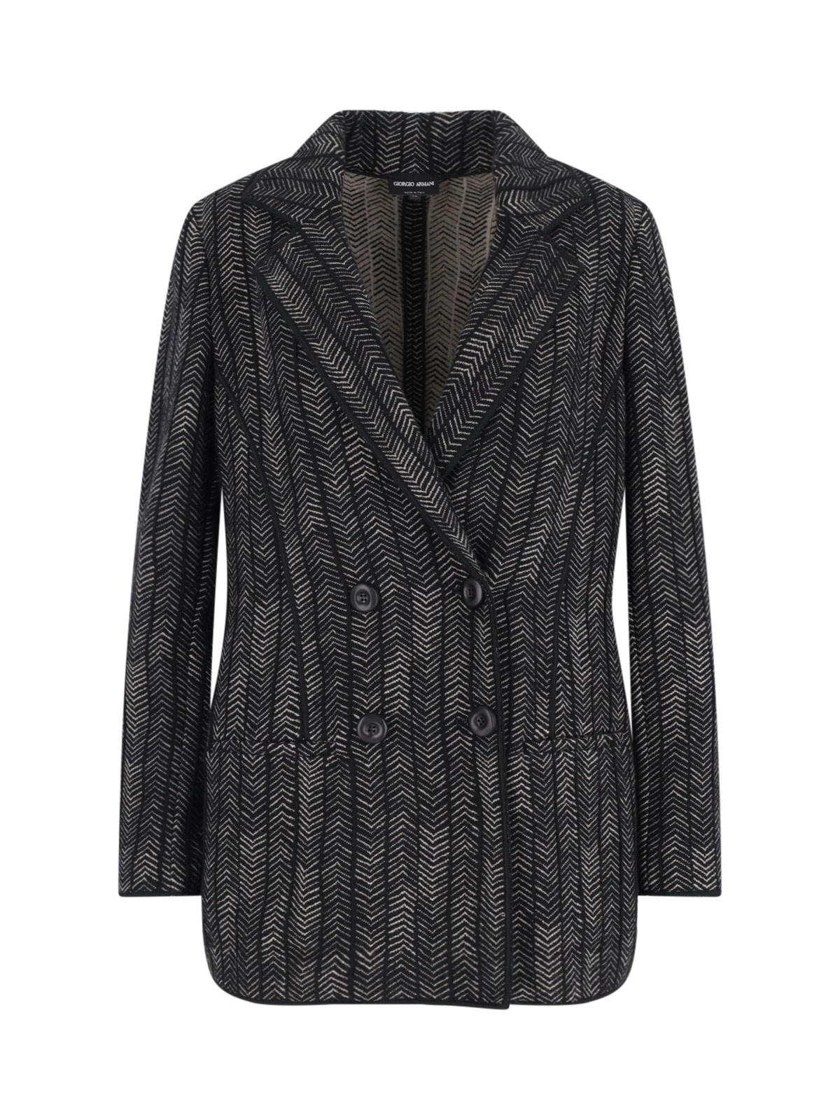 GIORGIO ARMANI DOUBLE-BREASTED CASHMERE AND VISCOSE BLAZER IN BLACK WITH HERRINGBONE PATTERN, CLASSIC LAPELS, BUTTON CLOSURE, TWO SIDE POCKETS, CURVED HEM. PRODUCT INFO PRODUCT CODE GW002373 AF19796FC006 COMPOSITION: 53% CASHMERE, 40% VISCOSE, 6% POLYAMIDE, 1% ELASTANE SIZE AND FIT: REGULAR FIT MADE IN: ITALY