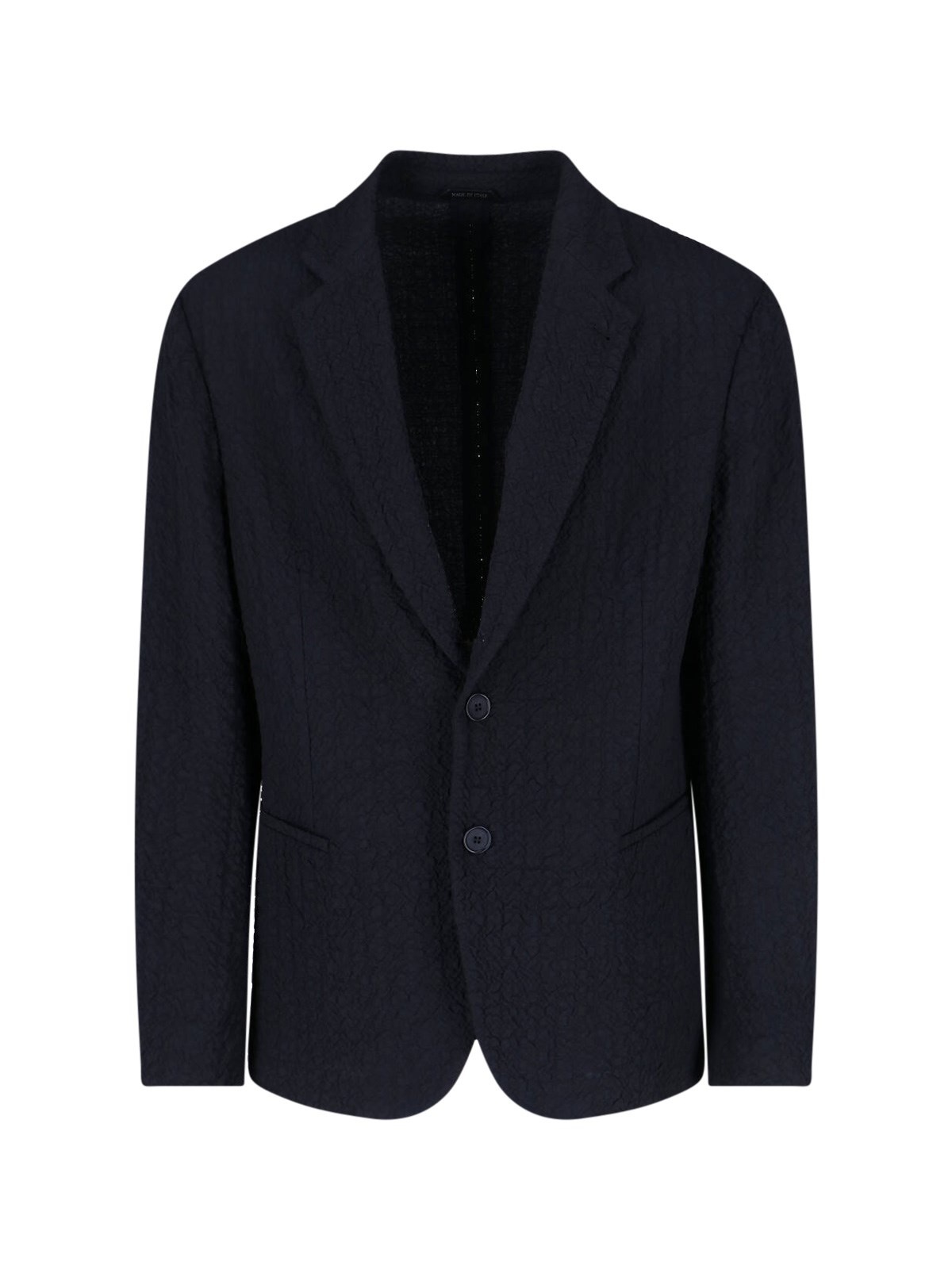 GIORGIO ARMANI SINGLE-BREASTED BLAZER IN BLUE VIRGIN WOOL WITH CLASSIC LAPELS, TWO BUTTON CLOSURE, TWO SIDE POCKETS, STRAIGHT HEM. PRODUCT INFO PRODUCT CODE GM001517 TE13955UB117 COMPOSITION: 99% VIRGIN WOOL, 1% ELASTANE SIZE AND FIT: REGULAR FIT MADE IN: ITALY