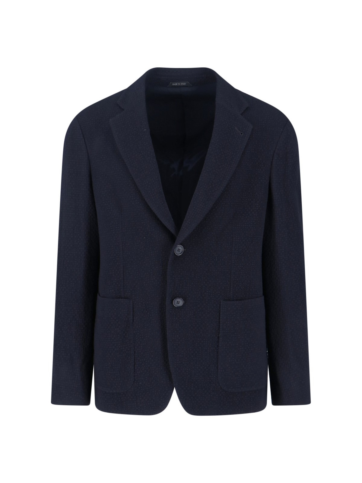 GIORGIO ARMANI BLUE SINGLE-BREASTED BLAZER IN NAVY VIRGIN WOOL, TEXTURED PATTERN, CLASSIC LAPELS, BUTTON CLOSURE, TWO FRONT POCKETS, INNER FLAT POCKET, STRAIGHT HEM. PRODUCT INFO PRODUCT CODE GM000027 TE16775UB115 COMPOSITION: 98% VIRGIN WOOL, 2% ELASTANE SIZE AND FIT: REGULAR FIT MADE IN: ITALY