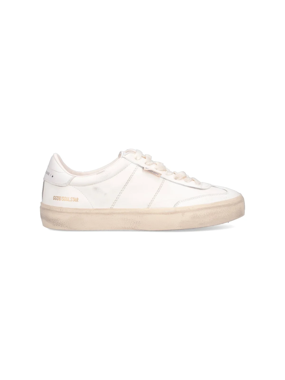 GOLDEN GOOSE "SOUL STAR" SNEAKERS IN WHITE LEATHER WITH ALL-OVER USURED DETAILS, ROUND TOE, LACE-UP CLOSURE, GOLD LOGO PRINT ON TONGUE, TONE-ON-TONE LOGO LABEL ON THE SIDE, GOLD LOGO PRINT ON THE SIDE, CONTRASTING LOGO PRINT ON THE TAB, CREAM RUBBER SOLE. PRODUCT INFO PRODUCT CODE GMF00464 F00504911629 COMPOSITION: 100% LEATHER MADE IN: ITALY - SOLE: 100% RUBBER