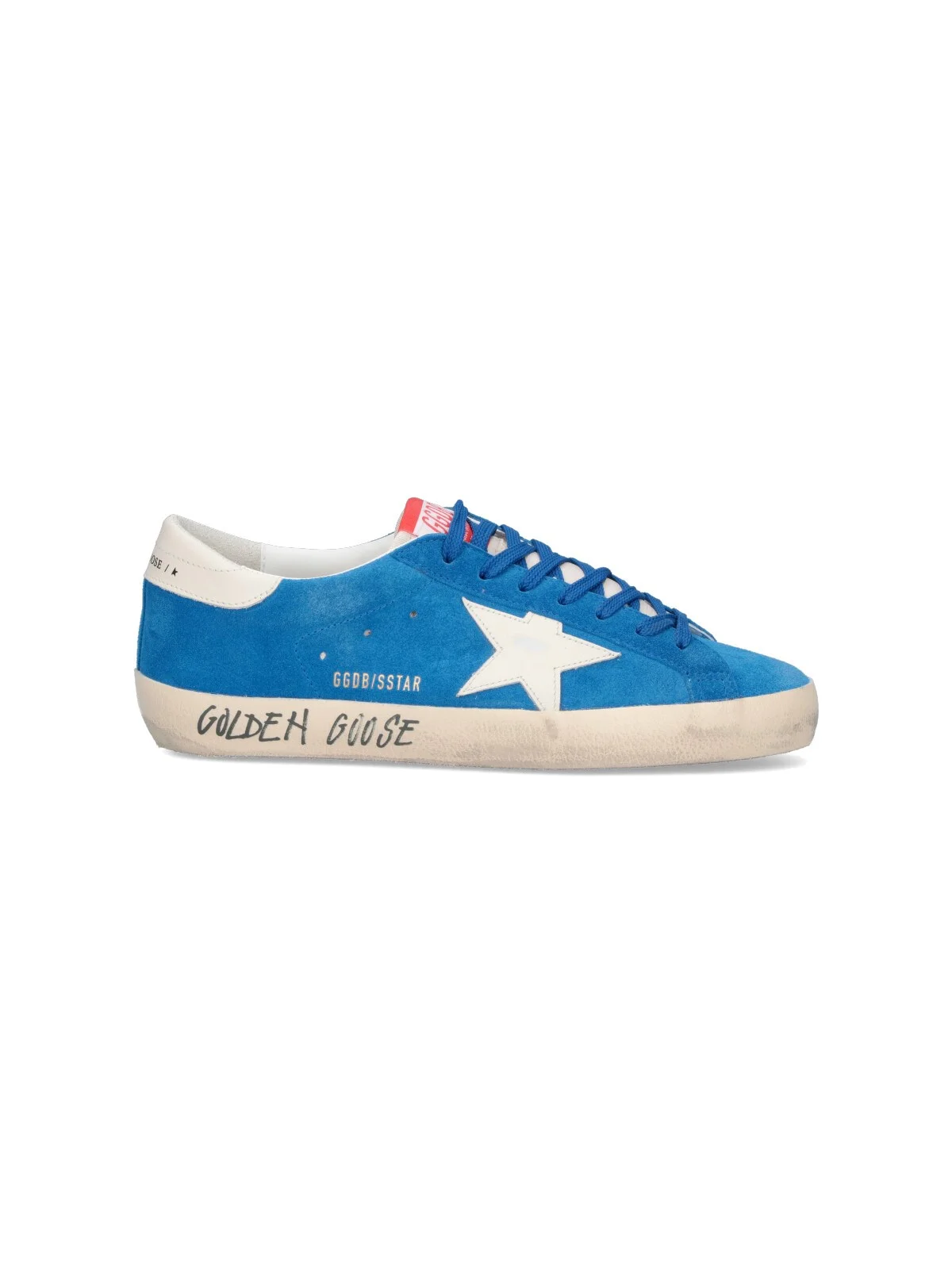 GOLDEN GOOSE "SUPER-STAR" SNEAKERS IN BLUE SUEDE WITH ALL-OVER USURED DETAILS, ROUND TOE, LACE-UP CLOSURE, LOGO LABEL ON THE TONGUE, SIDE STAR PATCH, GOLD EMBOSSED LOGO ON THE SIDE, LOGO PRINT ON THE BACK TAB, RUBBER SOLE, CONTRAST LOGO PRINT DETAIL ON THE SIDE. PRODUCT INFO PRODUCT CODE GMF00101 F00811650749 COMPOSITION: 87% CALF LEATHER, 13% POLYAMIDE MADE IN: ITALY - SOLE: 100% RUBBER
