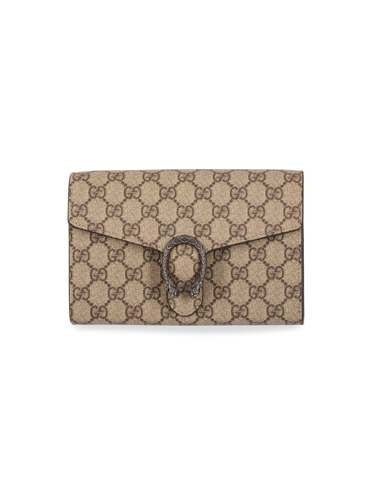 GUCCI 'DIONYSUS' CHAIN WALLET, MADE OF BEIGE "GG SUPREME" FABRIC, ALL-OVER LOGO PATTERN, CHAIN SHOULDER STRAP, TIGER HEAD CLOSURE, TWO INTERIOR BILL COMPARTMENTS, ONE INTERIOR ZIPPERED COIN POCKET, SIXTEEN CARD SLOTS, THREE SEPARATE INTERIOR COMPARTMENTS. PRODUCT INFO PRODUCT CODE 401231 KHNSN8642 - 100% FABRIC - H 13 X W 20 X D 6 CM - SHOULDER STRAP DROP: 23.5 CM MADE IN: ITALY