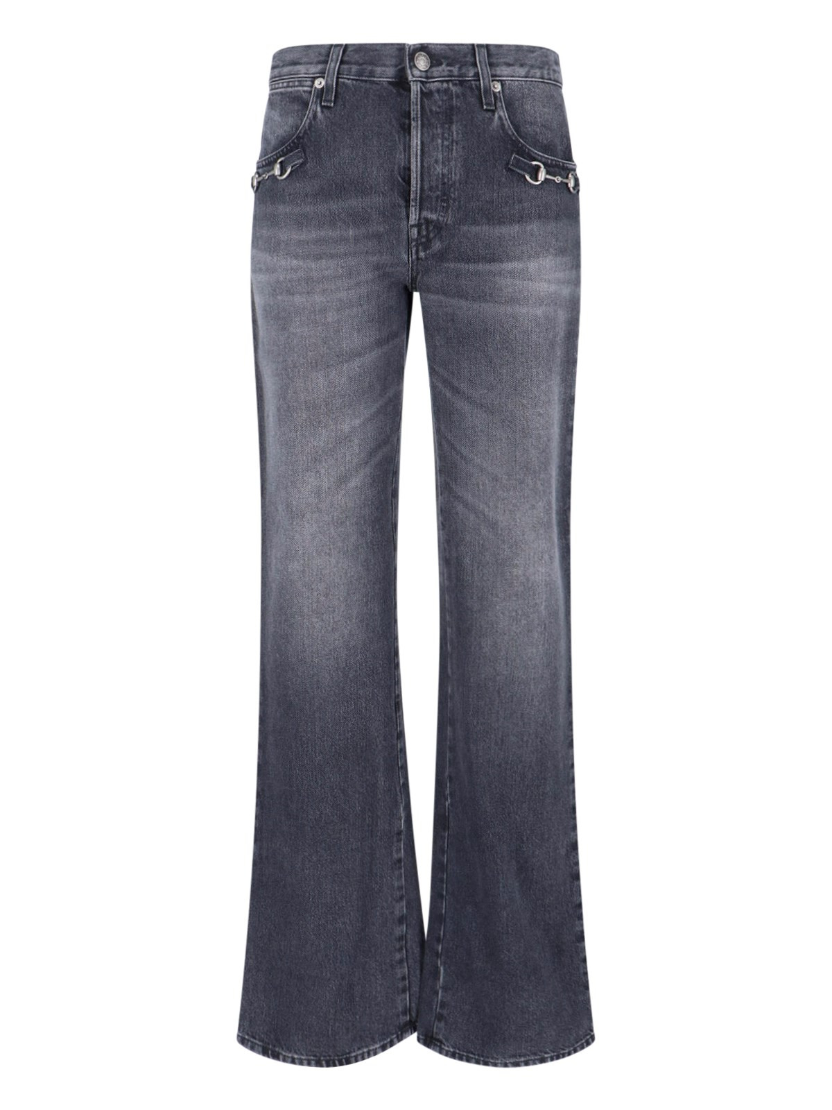GUCCI 'HORSEBIT' BOOTCUT JEANS IN GREY COTTON DENIM WITH MID WAIST, BUTTON CLOSURE, FIVE POCKETS, METAL 'HORSEBIT' ON THE SIDES, WIDE LEG. PRODUCT INFO PRODUCT CODE 864707 XDDF11165 COMPOSITION: 100% TEXTILE SIZE AND FIT: REGULAR FIT MADE IN: ITALY
