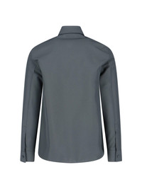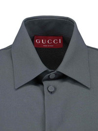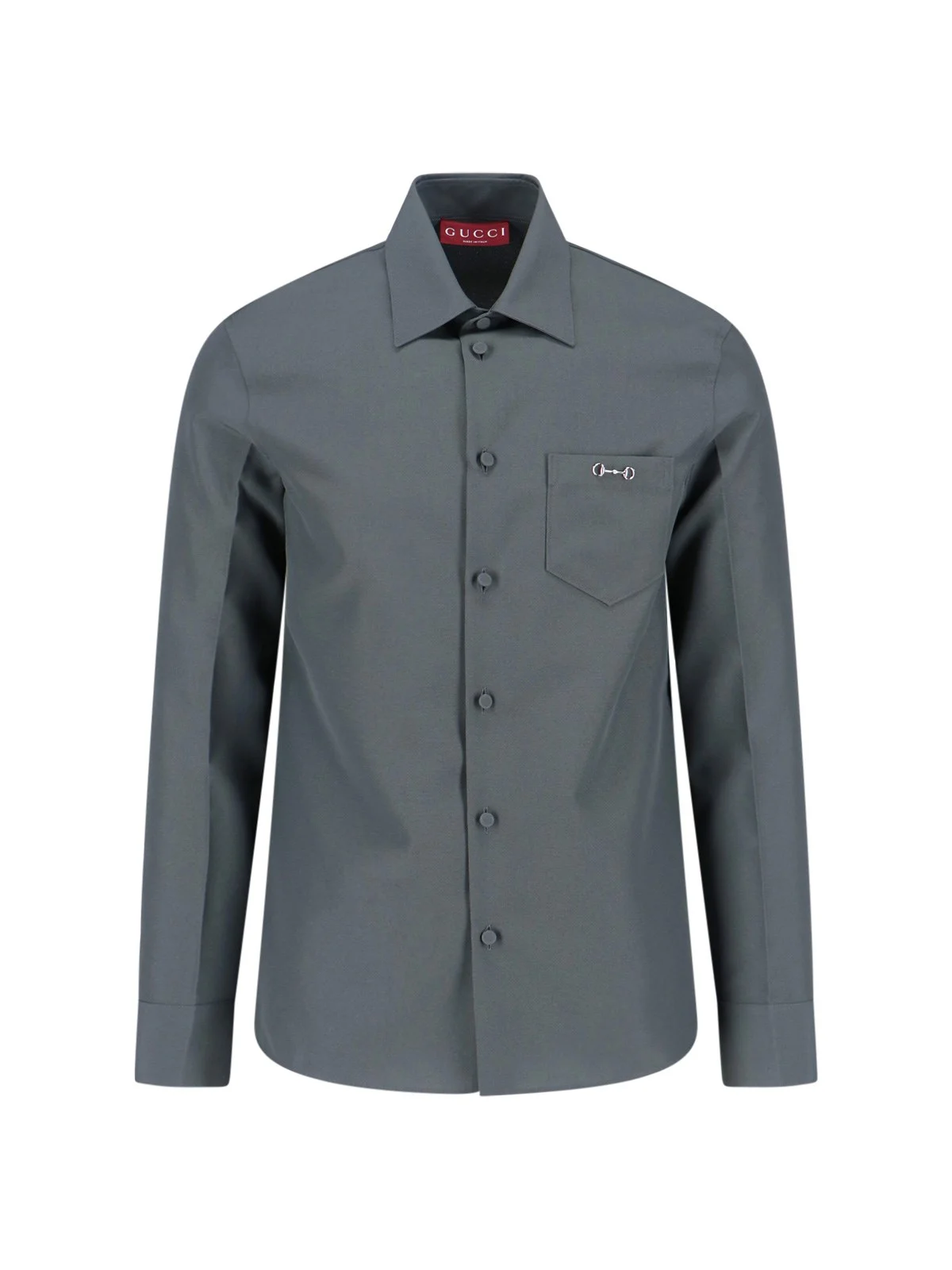 GUCCI "HORSEBIT" SHIRT IN GRAY FABRIC WITH CLASSIC COLLAR, TONE-ON-TONE BUTTON CLOSURE, LONG SLEEVES, FRONT POCKET, SILVER METAL "HORSEBIT" DETAIL ON THE FRONT, CURVED HEM. PRODUCT INFO PRODUCT CODE 841624 ZAFKB1088 COMPOSITION: 100% POLYESTER SIZE AND FIT: REGULAR FIT MADE IN: ITALY