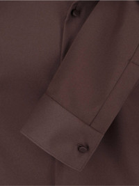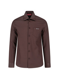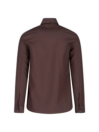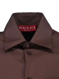 GUCCI "HORSEBIT" BROWN FABRIC SHIRT WITH CLASSIC COLLAR, TONE-ON-TONE BUTTON CLOSURE, LONG SLEEVES, FRONT POCKET, SILVER METAL "HORSEBIT" DETAIL ON THE FRONT, CURVED HEM. PRODUCT INFO PRODUCT CODE 841624 ZAT432518 COMPOSITION: 100% POLYESTER SIZE AND FIT: REGULAR FIT MADE IN: ITALY