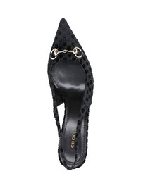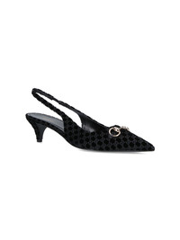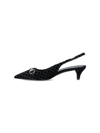 GUCCI "HORSEBIT" BLACK VELVET SLINGBACK PUMPS WITH ALL-OVER "GG" LOGO PATTERN, GOLD METAL "HORSEBIT" HARDWARE ON THE FRONT, ELASTICIZED STRAP, SLIP-ON FIT, LEATHER SOLE. PRODUCT INFO PRODUCT CODE 835978 FAETG1000 COMPOSITION: 100% TEXTILE SIZE AND FIT: HEEL HEIGHT 3.5 CM MADE IN: ITALY - TRIMS: 100% LAMBSKIN