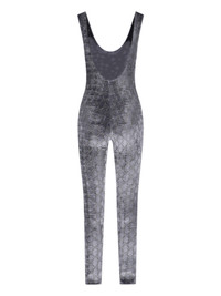 GUCCI "GG" CRYSTAL JUMPSUIT IN GRAY STRETCH VELVET WITH ALL-OVER "GG" CRYSTAL PATTERN, THIN SHOULDERS, FRONT AND BACK NECKLINE, AND NARROW LEG ON THE BOTTOM. PRODUCT INFO PRODUCT CODE 850293 XUANS1037 COMPOSITION: 77% VISCOSE, 21% POLYAMIDE, 2% ELASTANE SIZE AND FIT: SLIM FIT MADE IN: ITALY