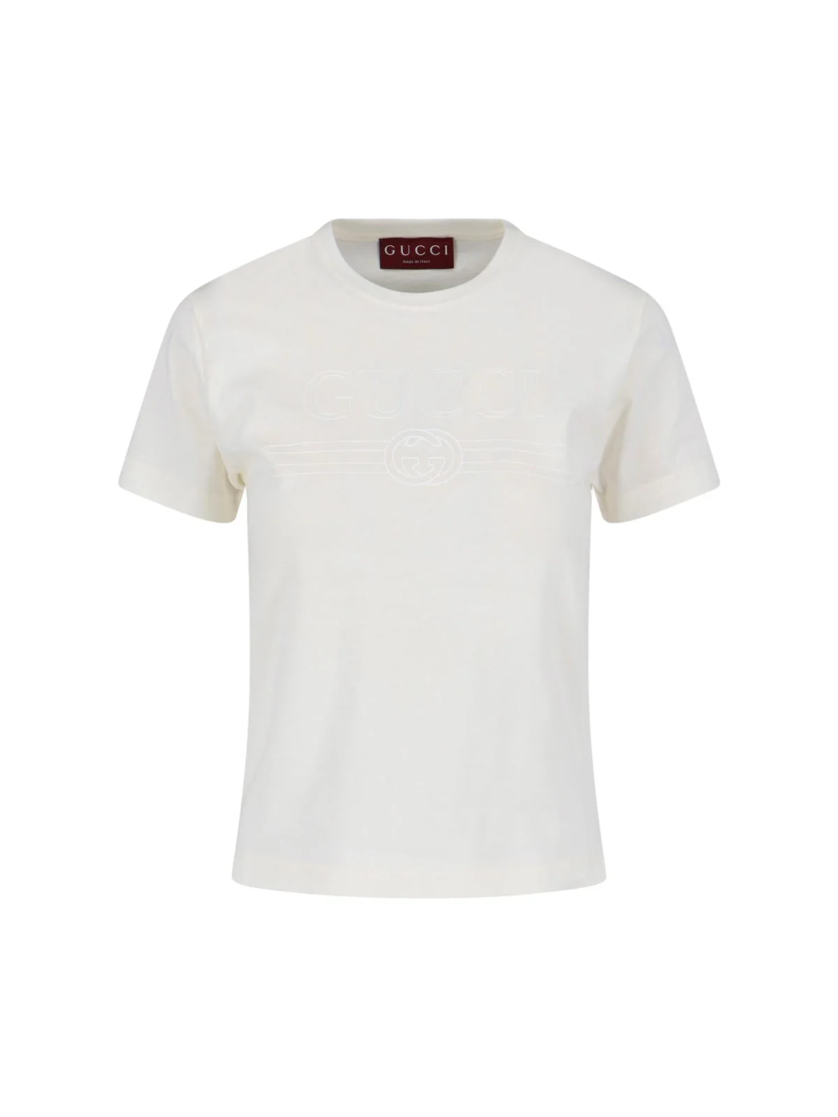 GUCCI LOGO T-SHIRT IN CREAM COTTON JERSEY, CREW NECK, SHORT SLEEVES, TONE-ON-TONE EMBOSSED LOGO ON THE FRONT, STRAIGHT HEM. PRODUCT INFO PRODUCT CODE 805285 XJHQ19750 COMPOSITION: 100% TEXTILE SIZE AND FIT: REGULAR FIT MADE IN: ITALY