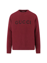 GUCCI RED WOOL LOGO SWEATER WITH RIBBED CREWNECK, MAXI LOGO EMBROIDERY ON THE FRONT, STRAIGHT HEM. PRODUCT INFO PRODUCT CODE 833499 XKEYJ6005 COMPOSITION: 100% WOOL SIZE AND FIT: REGULAR FIT MADE IN: ITALY