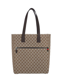 GUCCI MEDIUM TOTE BAG IN BEIGE MONOGRAM "GG" FABRIC, TWO TOP HANDLES, ZIP CLOSURE, FLAT FRONT ZIP POCKET, GREEN AND RED GROSS GRAIN WEB TAB DETAIL ON THE FRONT, MAIN INNER COMPARTMENT, INNER ZIP POCKET. PRODUCT INFO PRODUCT CODE 834456 FAEPS9752 COMPOSITION: 65% POLYESTER, 18% COTTON, 17% POLYAMIDE SIZE AND FIT: H 36 X W 32 X D 12 CM MADE IN: ITALY - HANDLE DROP: 28 CM - TRIMS: 100% CALF LEATHER