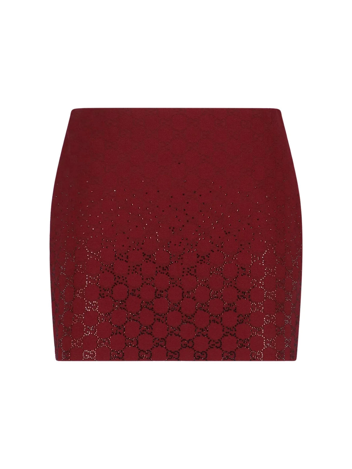 GUCCI "GG SUPREME" RED COTTON MINI SKIRT WITH ALL-OVER GG SUPREME PATTERN AND RHINESTONES, SIDE ZIP CLOSURE, STRAIGHT HEM. PRODUCT INFO PRODUCT CODE 853414 ZKU096207 COMPOSITION: 100% COTTON SIZE AND FIT: REGULAR FIT MADE IN: ITALY