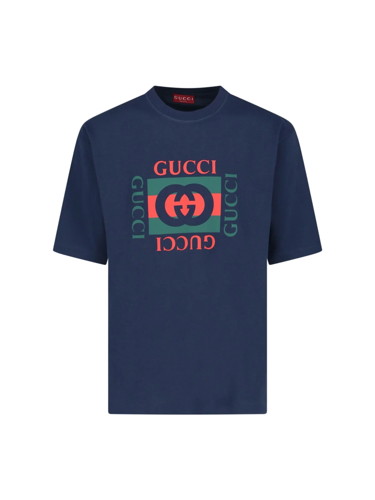 GUCCI PRINTED T-SHIRT IN NAVY BLUE COTTON JERSEY WITH RED AND GREEN DETAILS, CREW NECK, SHORT SLEEVES, INCROCIO GG LOGO PRINT ON THE FRONT, RIBBED TRIM, STRAIGHT HEM. PRODUCT INFO PRODUCT CODE 784361 XJGKA4735 COMPOSITION: 100% COTTON SIZE AND FIT: OVERSIZED FIT MADE IN: ITALY