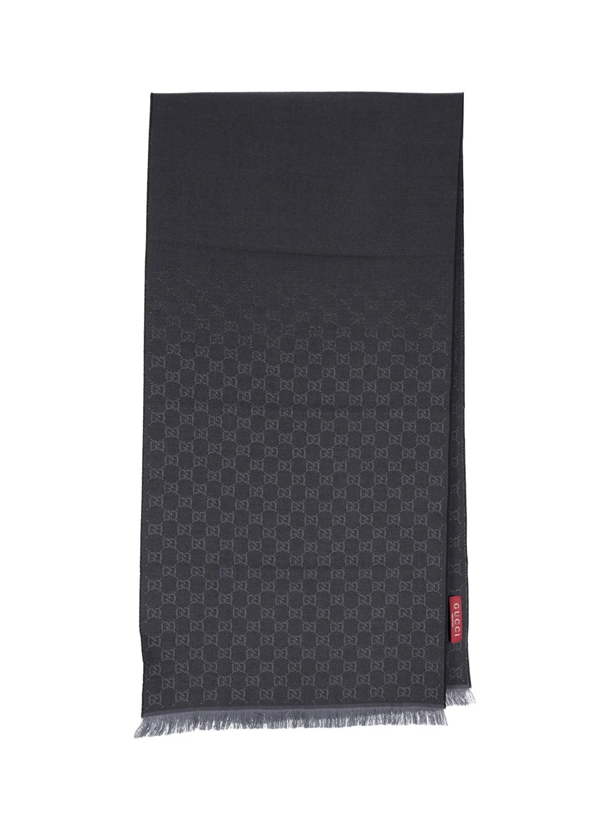 GUCCI GG SUPREME SCARF IN BLACK WOOL, ALL-OVER "GG SUPREME" LOGO PATTERN, RECTANGULAR DESIGN, FRINGED EDGE. PRODUCT INFO PRODUCT CODE 848507 3G2001063 COMPOSITION: 100% WOOL SIZE AND FIT: H 180 X W 47 CM MADE IN: ITALY