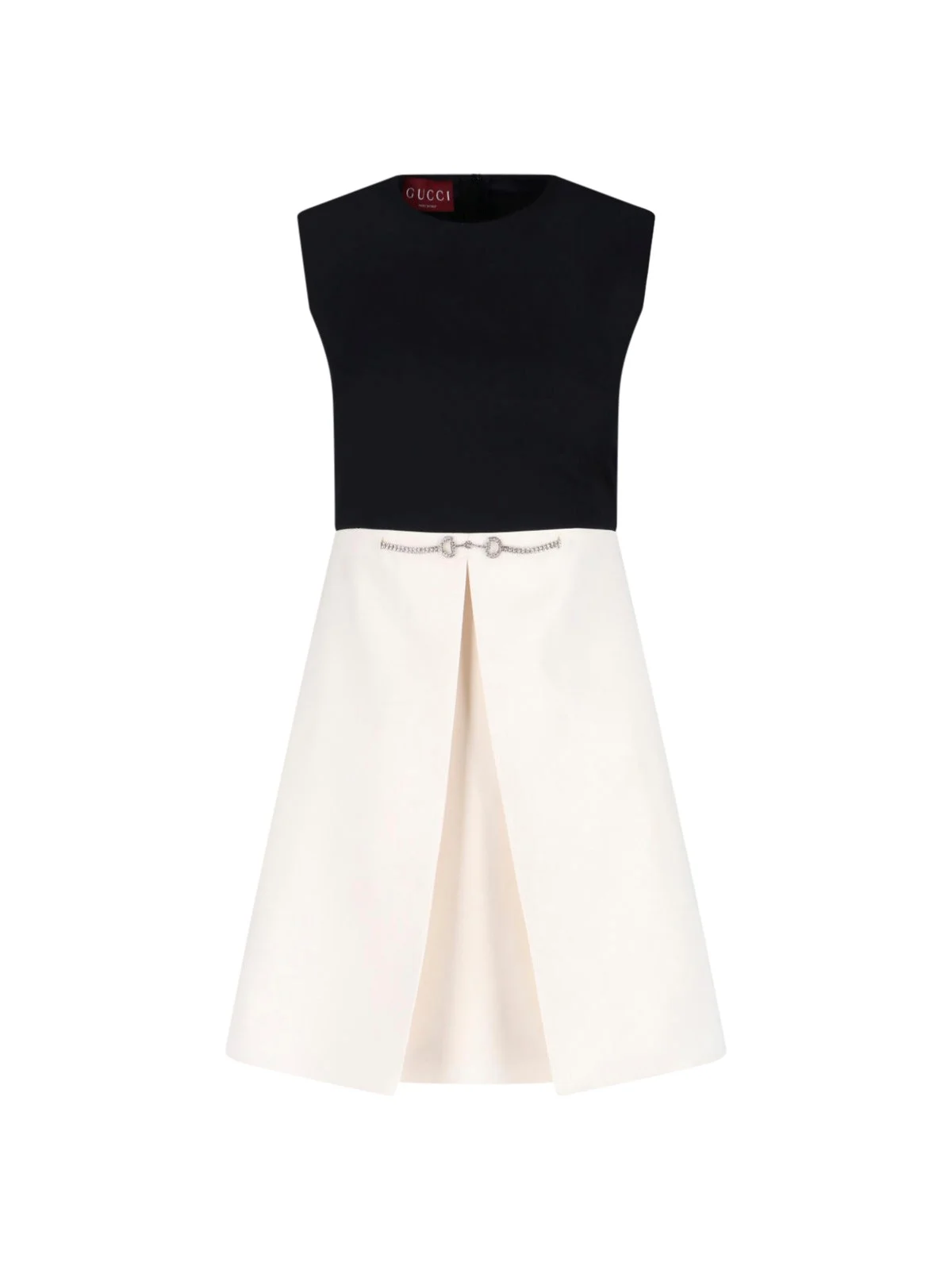GUCCI WHITE SLEEVELESS MINI DRESS IN SILK AND WOOL WITH BACK ZIP CLOSURE, METAL 'HORSEBIT' DETAIL ON THE FRONT, FRONT SLIT, STRAIGHT HEM. PRODUCT INFO PRODUCT CODE 842667 ZAD889002 COMPOSITION: 100% SILK SIZE AND FIT: REGULAR FIT MADE IN: ITALY