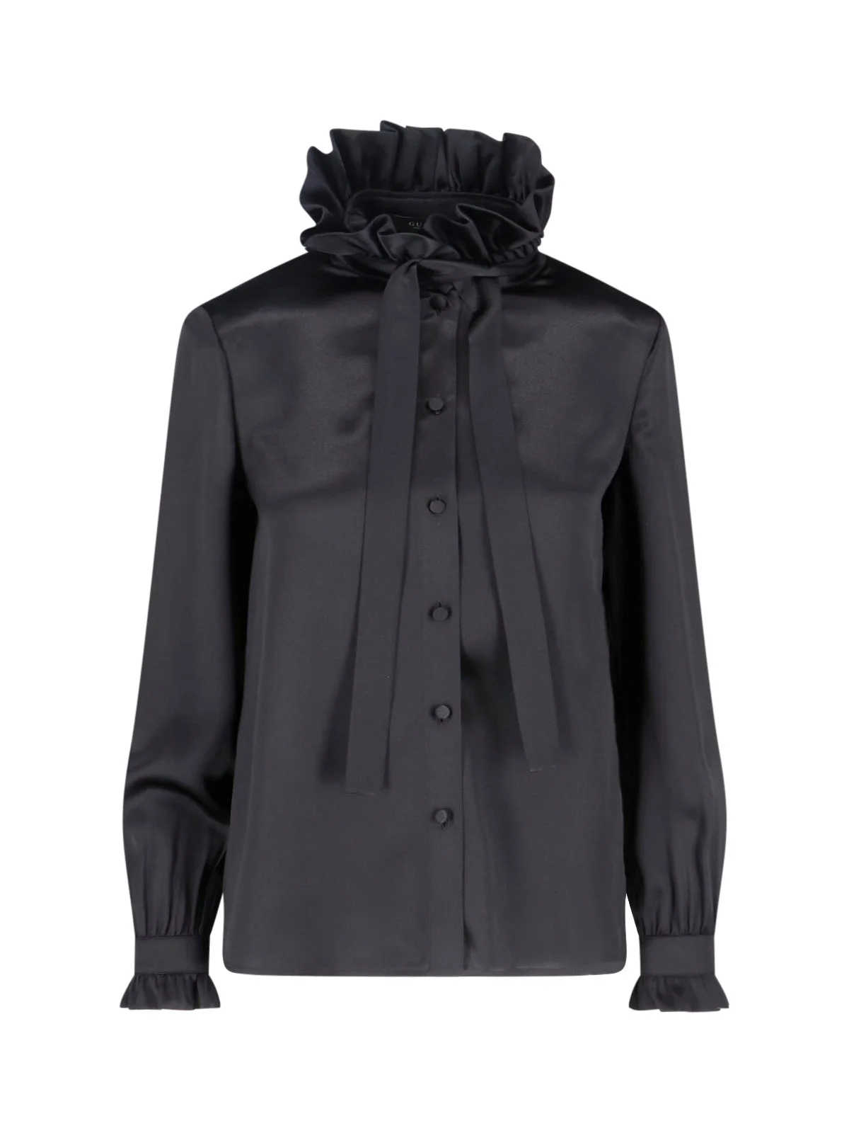 GUCCI BLACK SILK SATIN SHIRT WITH RUFFLE COLLAR AND KNOTTED BOW DETAIL. MOTHER-OF-PEARL BUTTON CLOSURE, RUFFLE TRIMS, STRAIGHT HEM PRODUCT INFO PRODUCT CODE 860509 ZHS191000 COMPOSITION: 100% SILK SIZE AND FIT: REGULAR FIT MADE IN: ITALY - TRIMS: 100% MOTHER OF PEARL