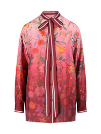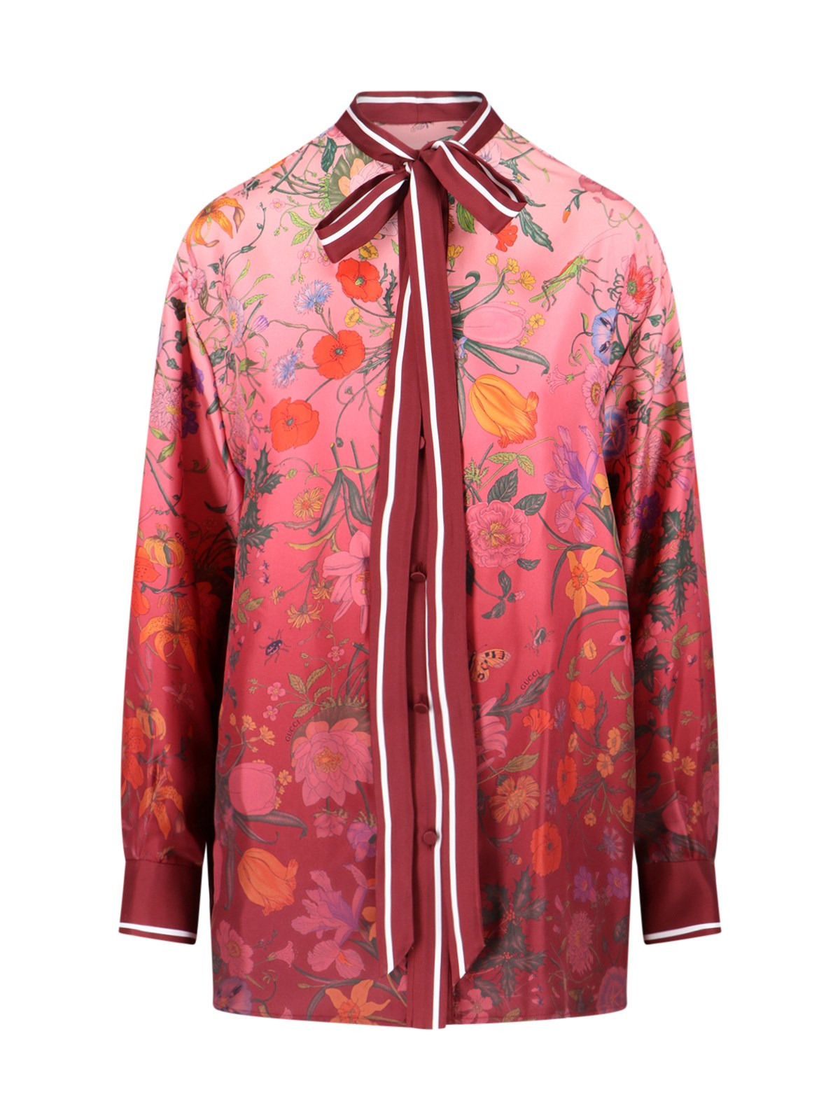 GUCCI PINK AND RED 'ANCORA' SILK SHIRT WITH BOW, ALL-OVER MULTICOLOR FLORAL PRINT, BOW DETAIL KNOTTED ON THE FRONT, BUTTON CLOSURE, CONTRAST TRIM ON CUFFS, LONGER HEM. PRODUCT INFO PRODUCT CODE 835617 ZATG85057 COMPOSITION: 100% SILK SIZE AND FIT: SOFT FIT MADE IN: ITALY