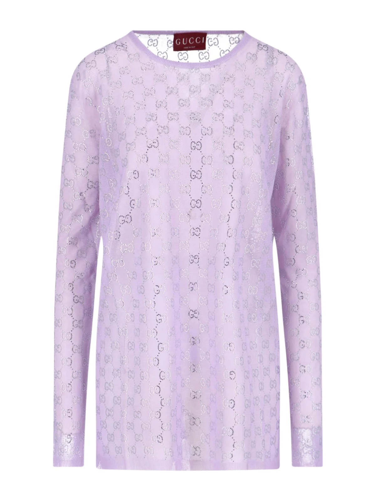 SILK SWEATER WITH GUCCI CRYSTALS, PINK, CREW NECK, LONG SLEEVES, "GG SUPREME" LOGO PATTERN WITH ALL-OVER APPLIED CRYSTALS, RIBBED TRIM, STRAIGHT HEM. PRODUCT INFO PRODUCT CODE 852233 XKFC55419 COMPOSITION: 100% SILK SIZE AND FIT: REGULAR FIT MADE IN: ITALY